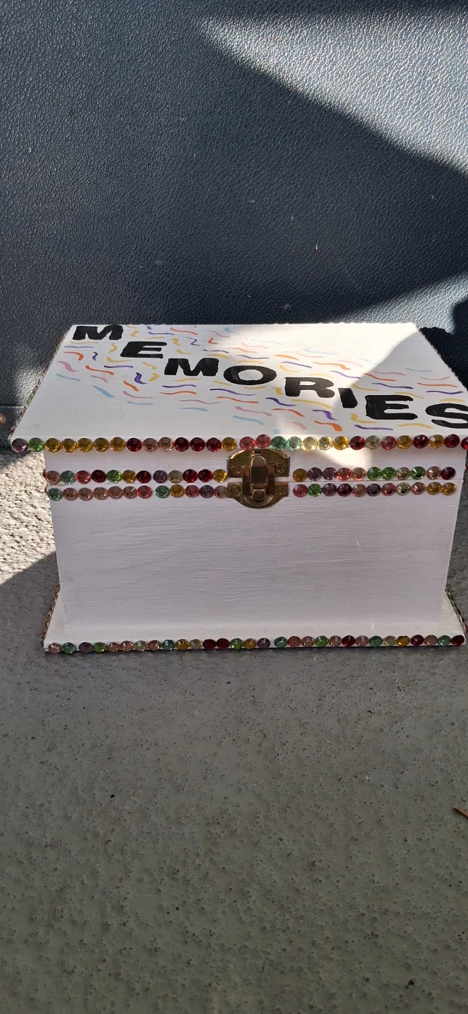This charming white keepsake box is hand-painted with the word "Memories" and colourful wavy lines. It features a decorative clasp and colourful gem accents along the lid and base. It's perfect for storing small treasures and sentimental items. A lovely way to keep your most cherished mementos safe!