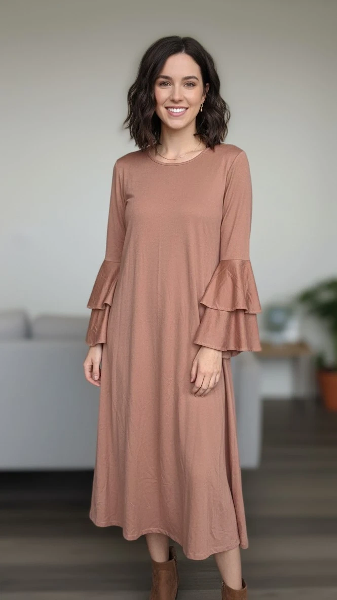 Brown Midi Dress with Ruffle Sleeves (Size Large)