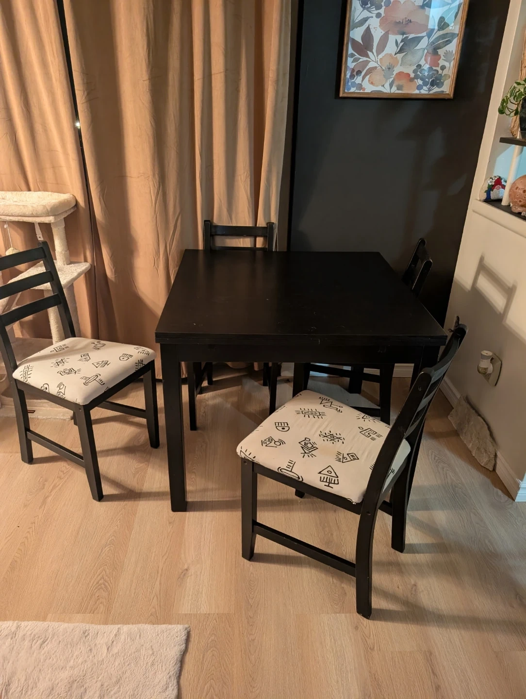 Selling a black dining table with four chairs. The chairs have patterned seat cushions. It's in great condition and ready for a new home!