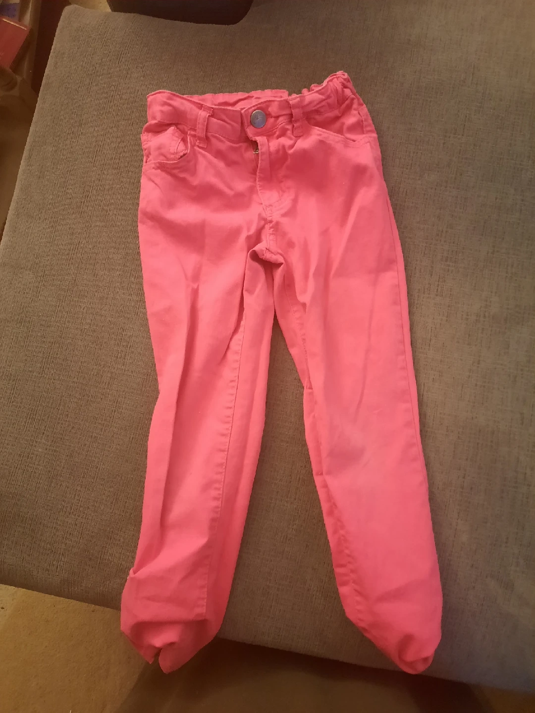 The image shows a pair of pants, specifically pink or coral-colored skinny-leg pants. They appear to be made of a chino-like material and have a button and zipper closure. Kids size 6