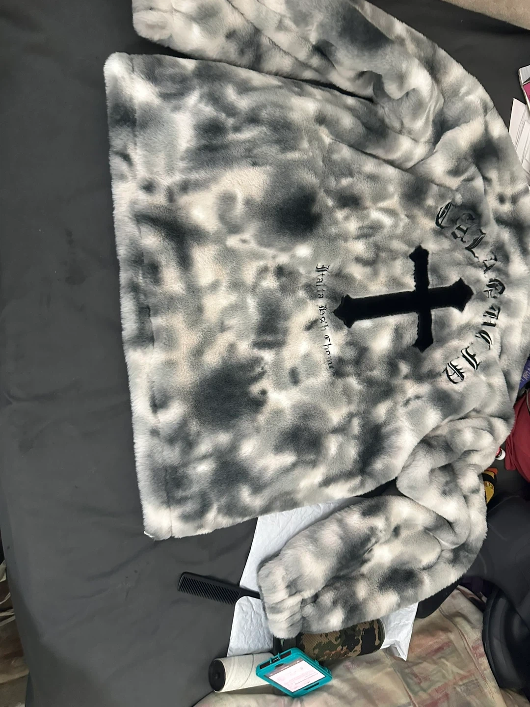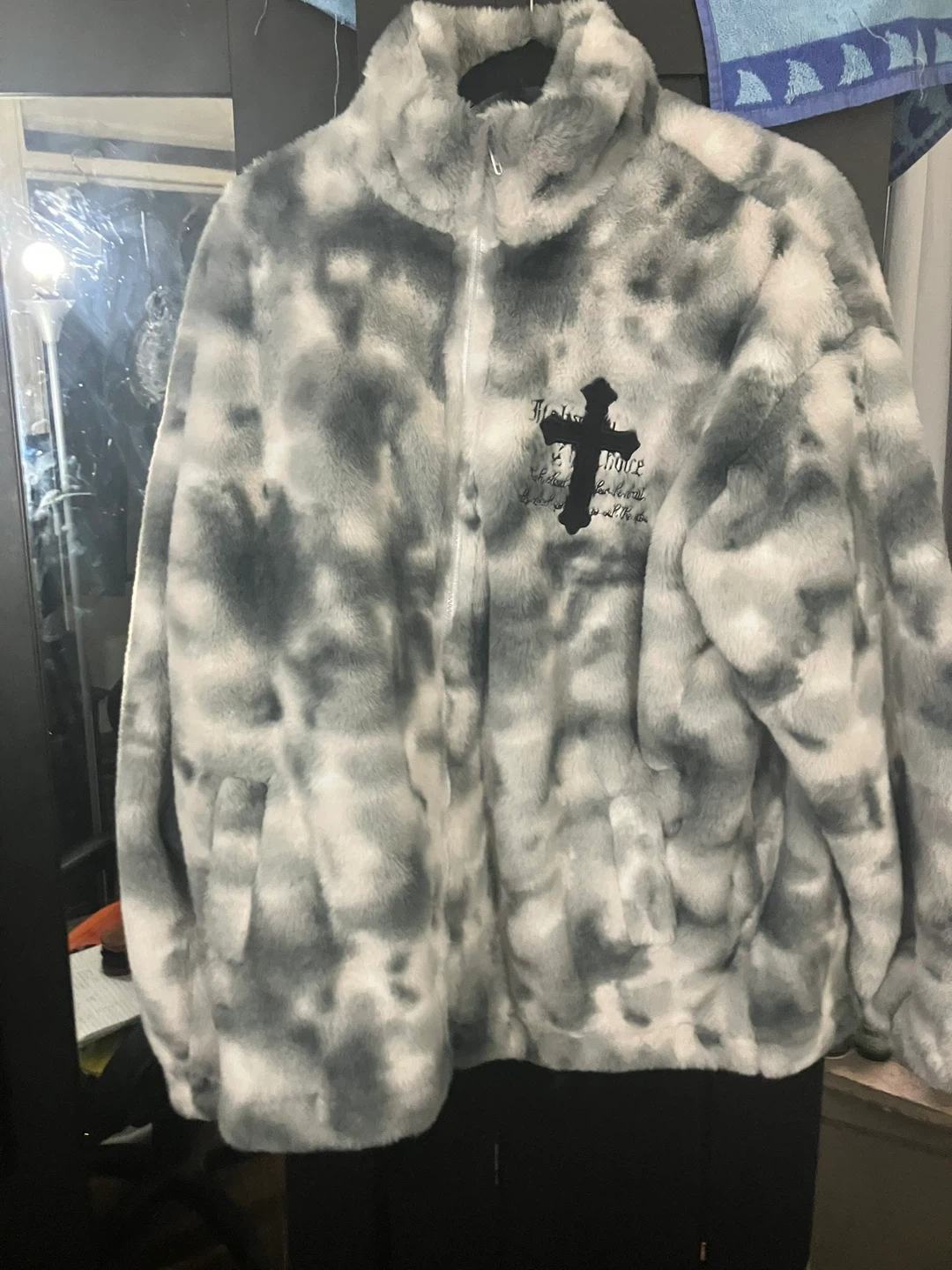 Selling a cozy faux fur jacket with a unique cross design on the front and back. It features a soft, plush texture and a stylish gray and white cloud pattern. Perfect for adding a touch of edgy warmth to your wardrobe!