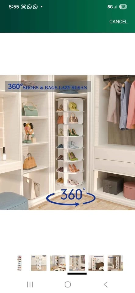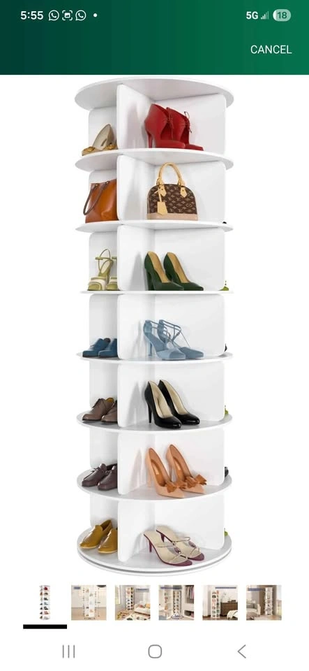Brand new seven tier rotating shoe rack tower, 360° free standing shoe organizer lazy susan, bag display rack round carousel, neat and elegant shoe storage solution. Pet free and smoke free home. Can be delivered based on my availability