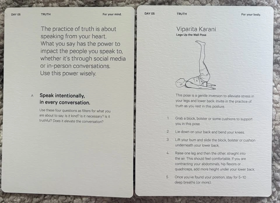 Set of 7 Lululemon Practice Cards. 7 days, each day has a card for the mind and a card for the body. The back of each card goes more into depth with instructions.