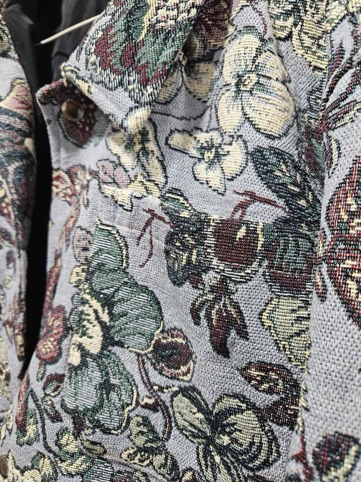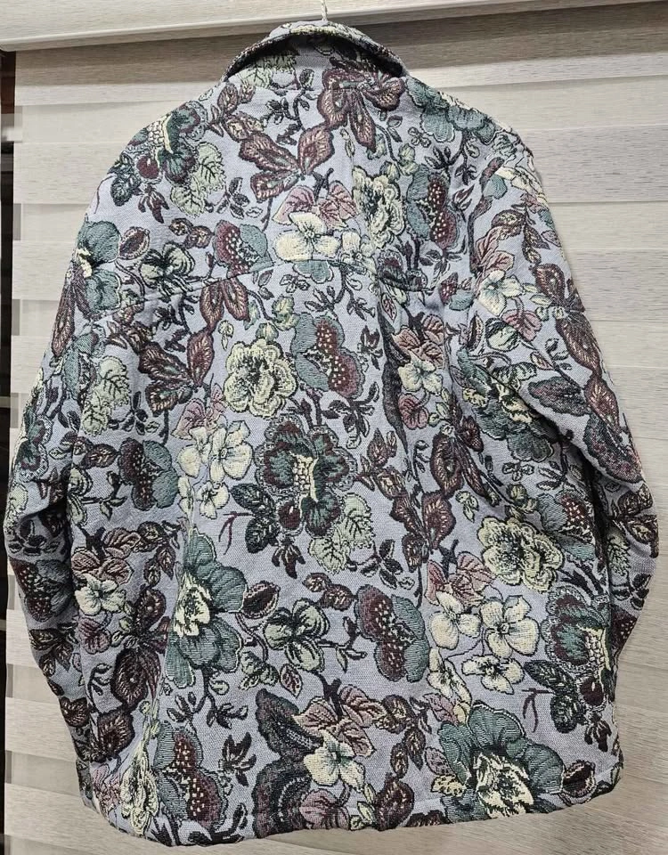 This is a used Zara floral jacket in a size large, perfect for adding a unique touch to your wardrobe. The jacket features a distinctive floral pattern on a woven fabric and is in good condition, ready for its next adventure. This fashionable piece is sure to turn heads and keep you stylishly warm.