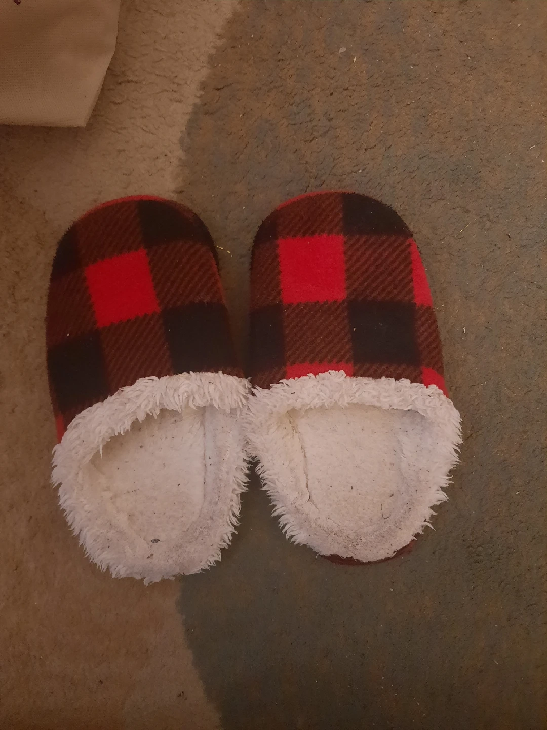 The slippers have a red and black buffalo plaid pattern on the upper part, and a white, fluffy, sherpa-like lining on the inside and around the opening. They are designed for indoor wear and are commonly referred to as fleece slippers or plaid slippers.
