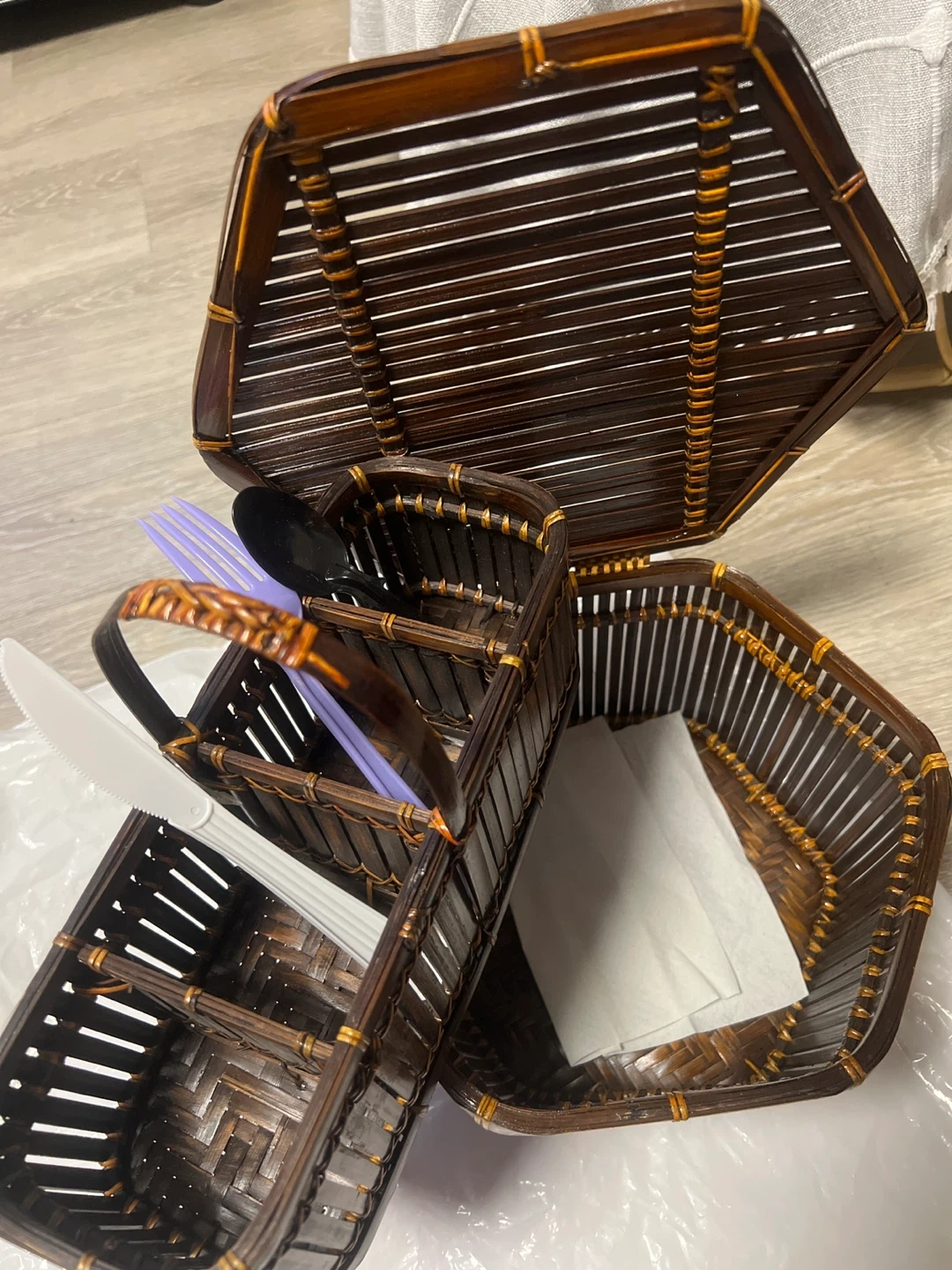 Here's a woven bamboo cutlery caddy with a lid! It's perfect for storing and organizing your silverware and napkins. It has a rustic and natural look that would complement any table setting