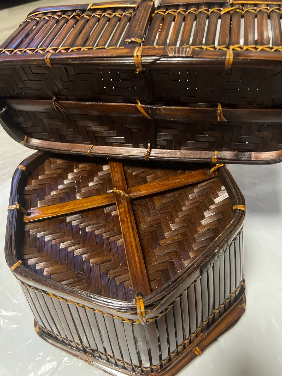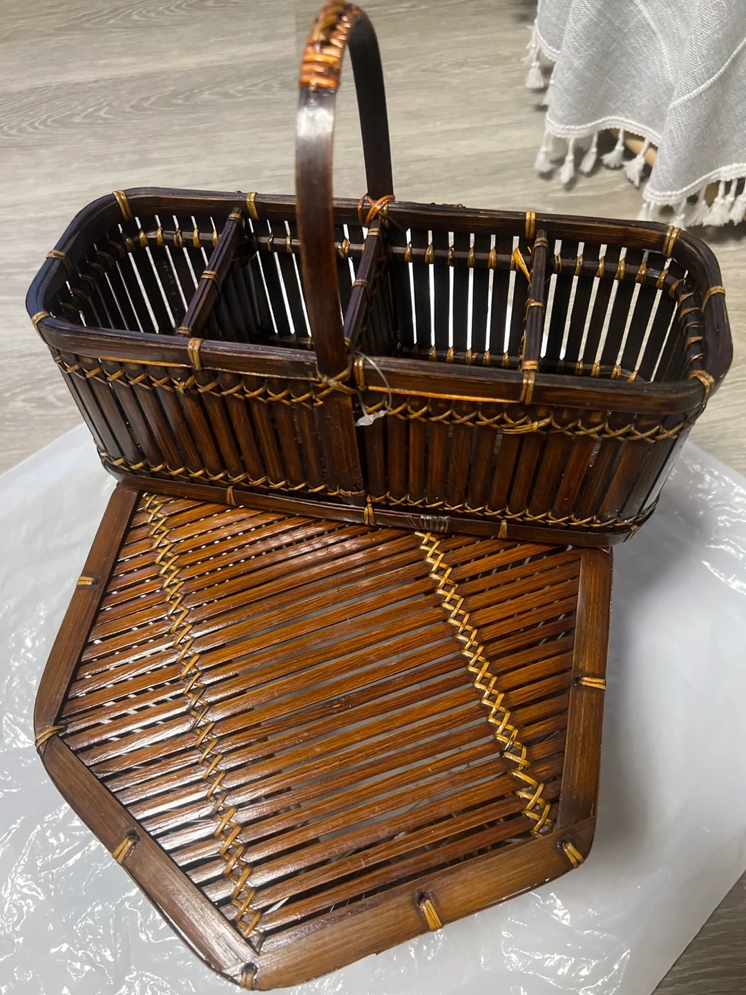 Here's a woven bamboo cutlery caddy with a lid! It's perfect for storing and organizing your silverware and napkins. It has a rustic and natural look that would complement any table setting