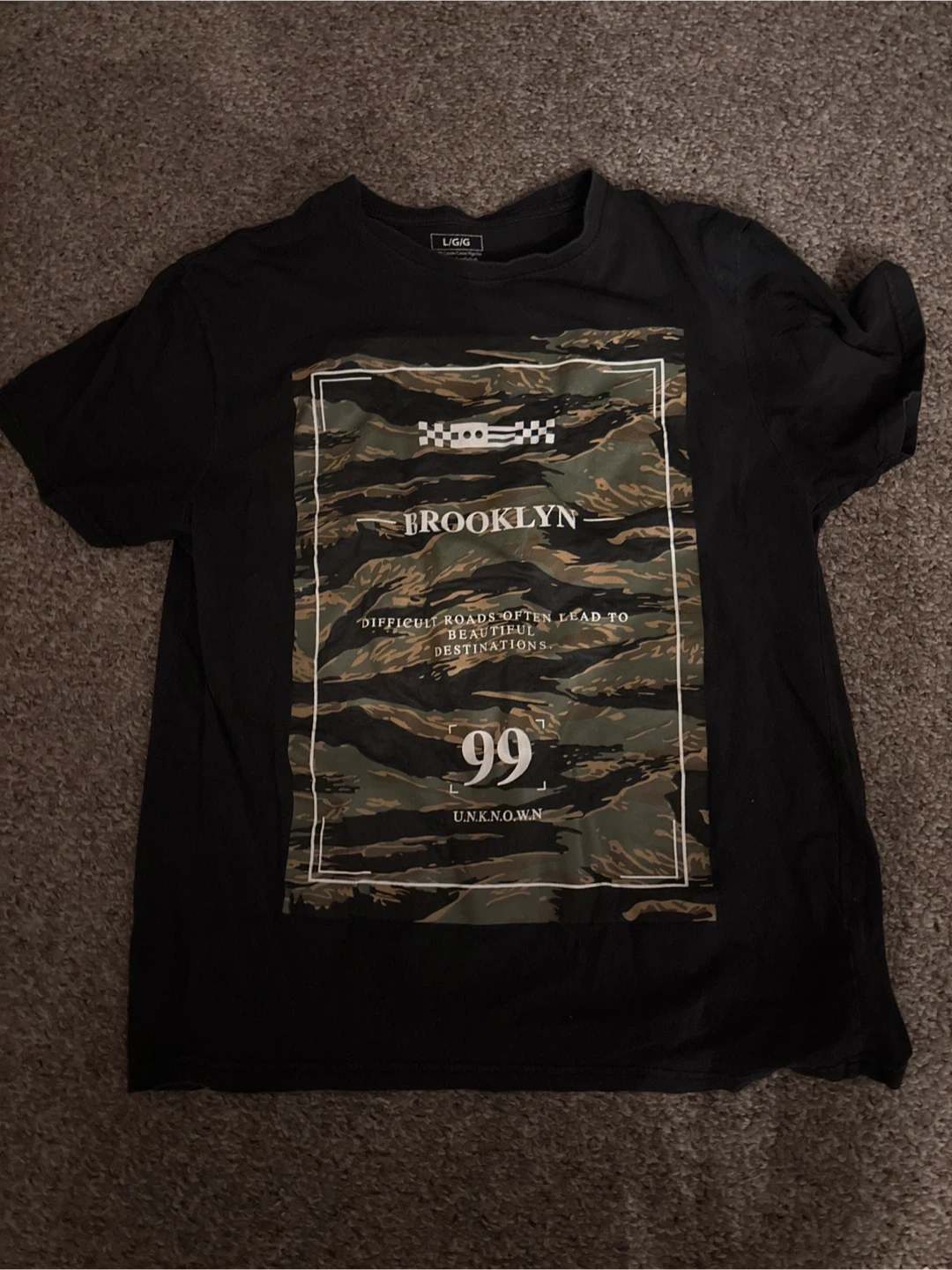 Selling a Brooklyn graphic t-shirt in size large. It features a unique design with "BROOKLYN" printed on the front, along with a camouflage pattern and the number 99. The shirt is made of 100% cotton and was manufactured in Bangladesh.