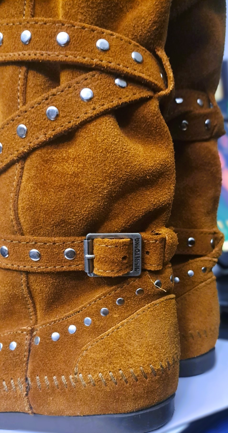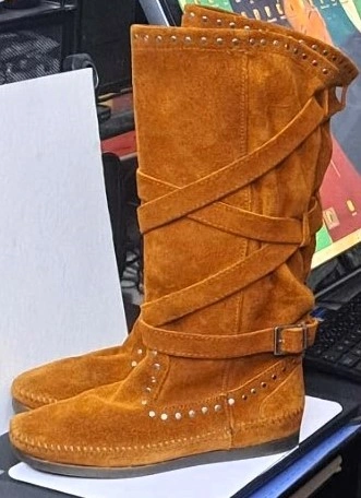 This classic pull-on mid-calf style of Minnetonka Boots is versatile and has been a fashion staple for decades. It is comfortable, durable, and features the highest-quality suede leather, rubber-soled and construction. It has reversible boot straps: plain or with silver metal accents [please check photos]. Dress up your favourite skirt, leggings, or skinny jeans in these famous and versatile boots, just as trendsetters and fashionistas do everywhere. Well kept and sanitized and cared for beautifully. For pick-up and serious inquiries only.