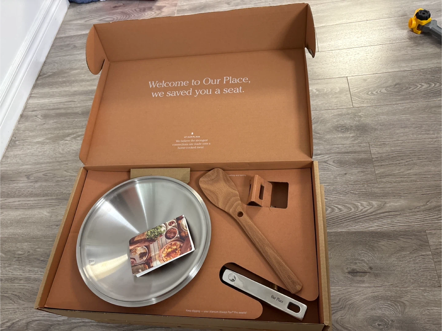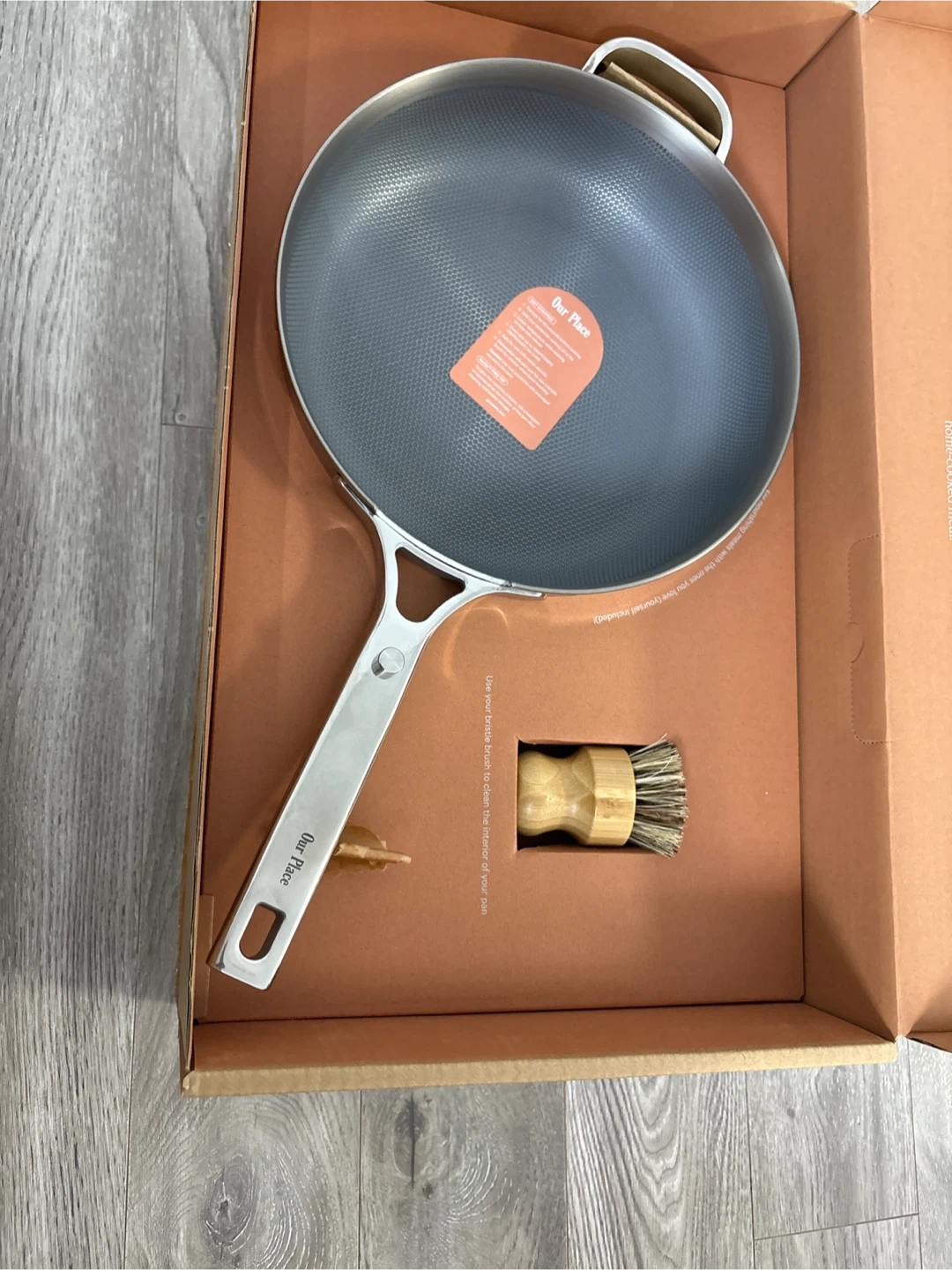 Selling an Our Place Always Pan Pro in Chrome! It's 2.8QT/2.7L and comes with the original box. Included are the pan, a beechwood spatula, and a bristle brush. Perfect for all your cooking needs!