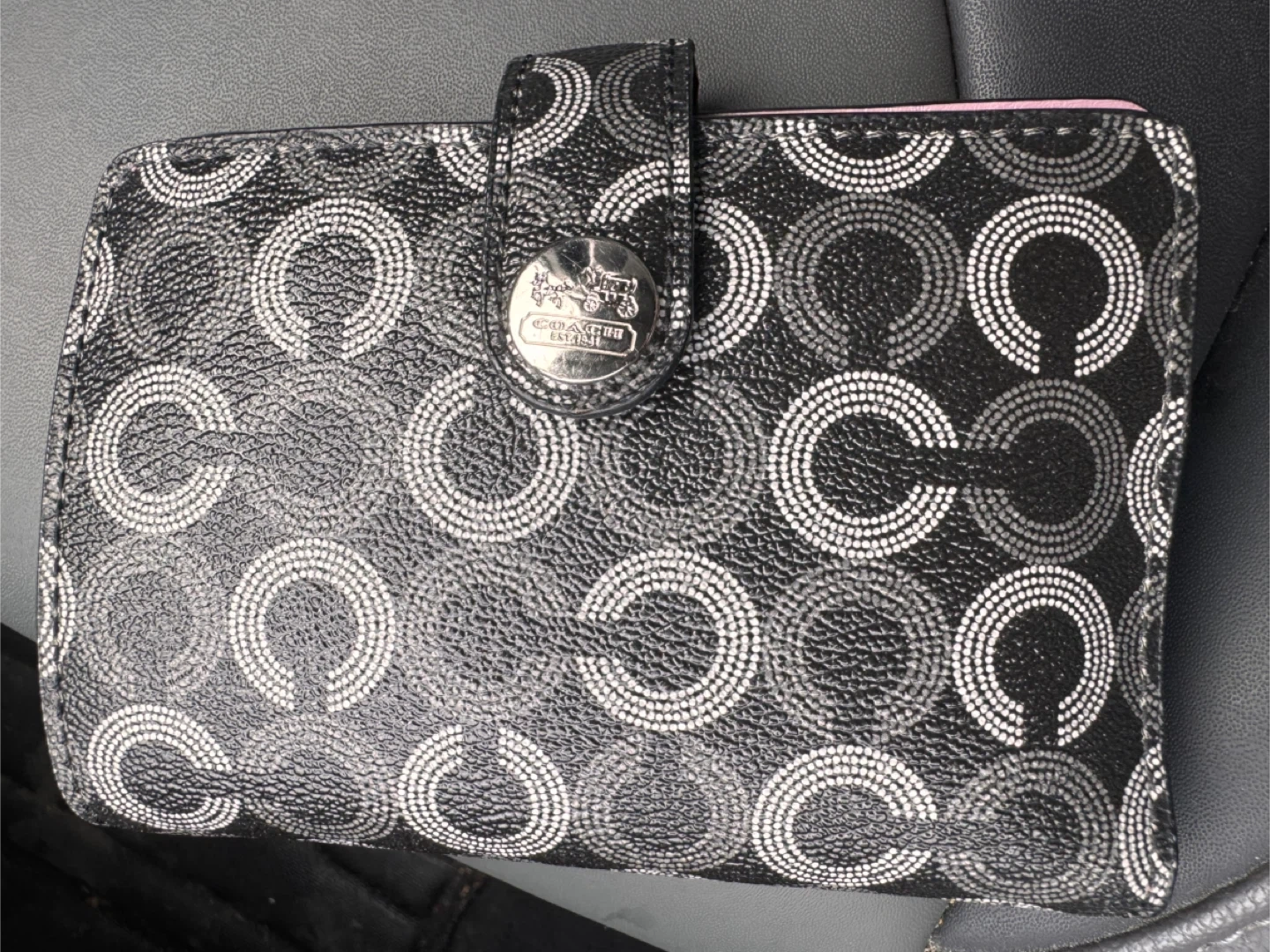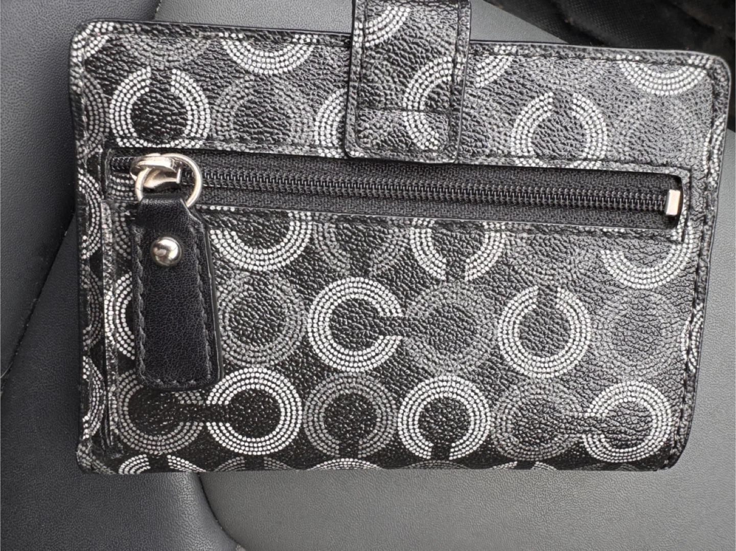 Selling a Coach wallet in a stylish black and silver pattern. It's in great condition and has a convenient zip pocket and a snap closure. Perfect for keeping your cards and cash organized!