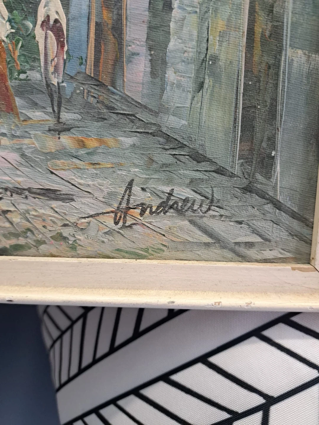Selling a framed oil painting with a signature that looks like 'Andrew'. It depicts a European street scene with figures and a tower.