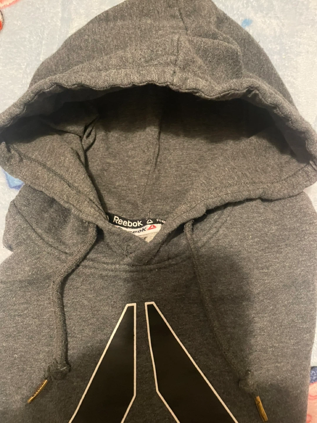 Selling a grey Reebok hoodie. It's in great shape and has the classic Reebok logo on the front. Perfect for staying cozy! I notes that on the one side of the hoodie the string is loose. Picture attached.Needs to be pushed in.