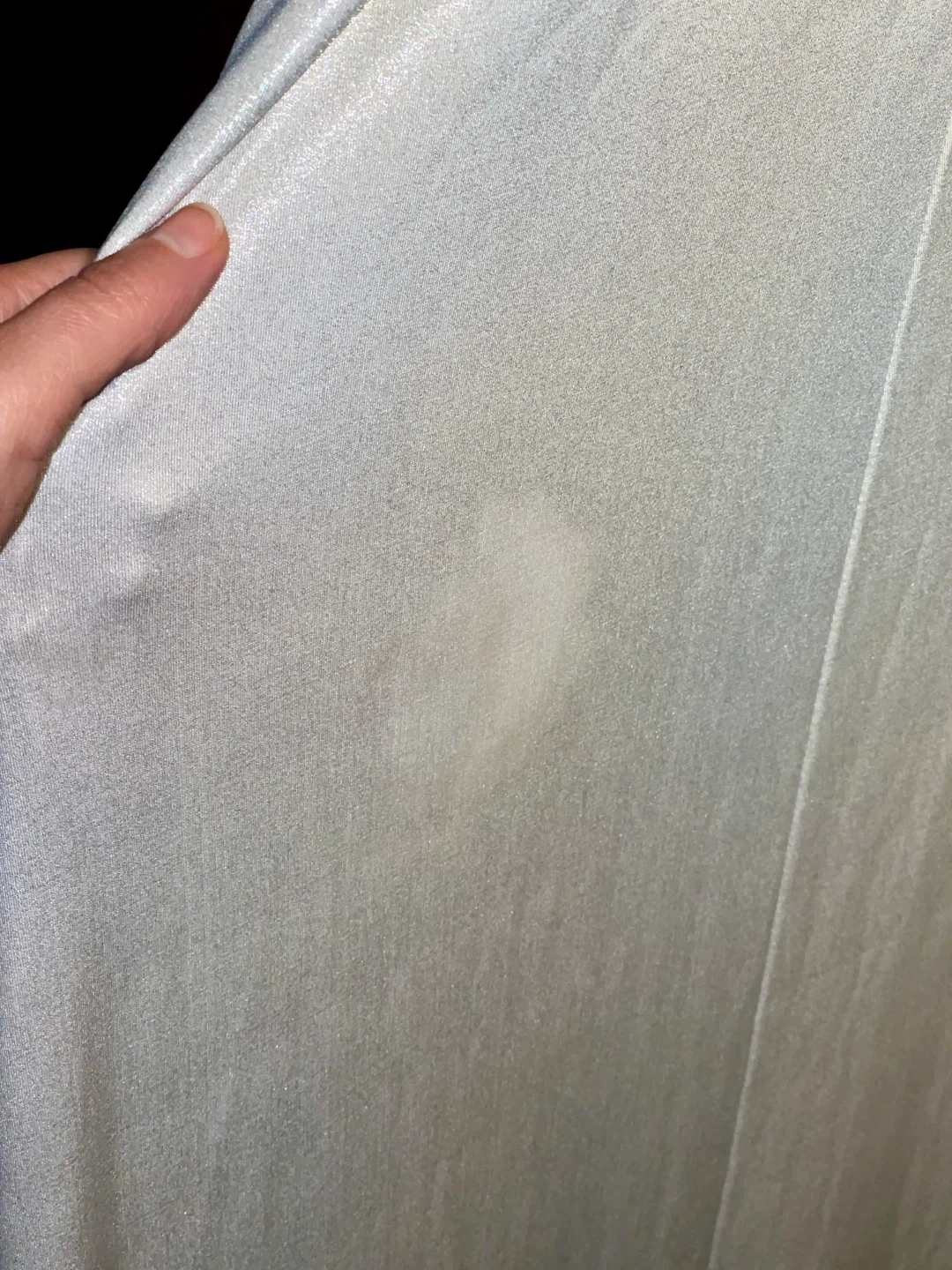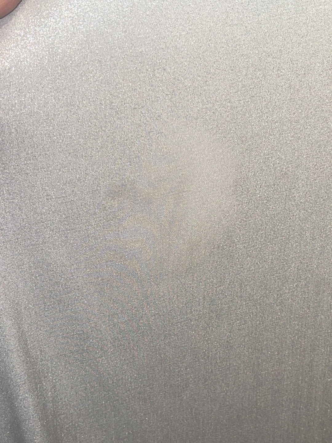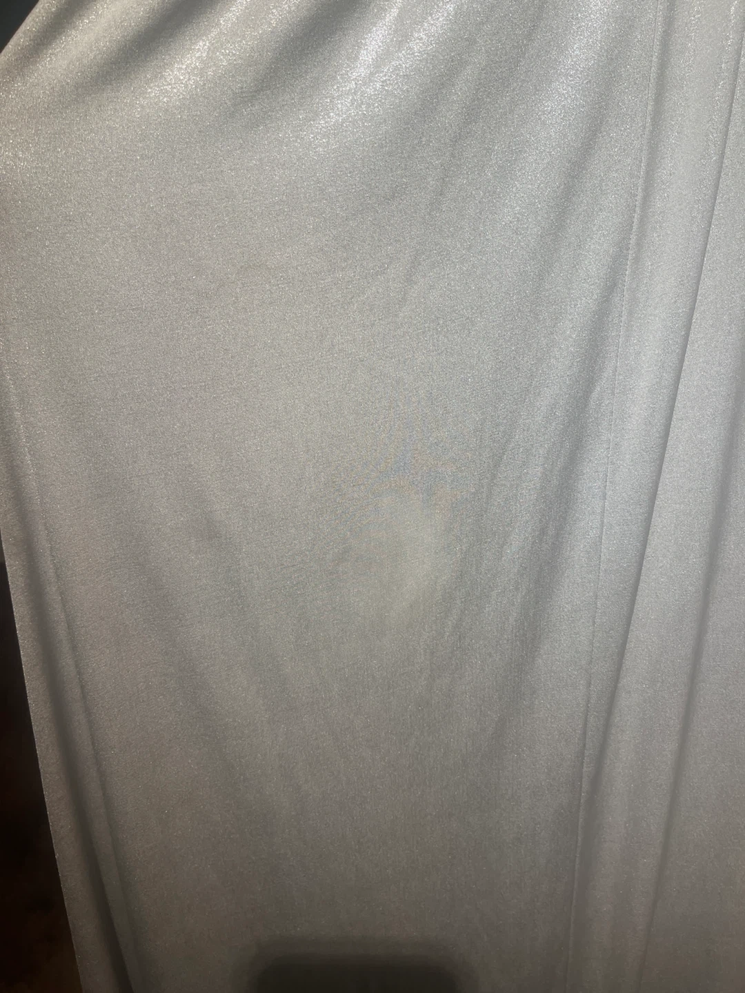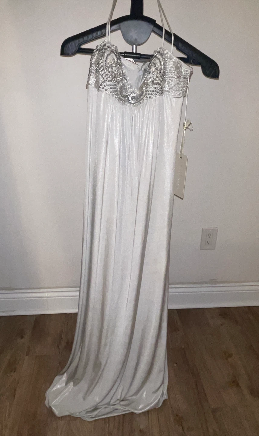 New with tags. Size US 10. There is an are of discolouration as pictured on the back/side of the dress that is visible in certain lighting. No damage to the dress otherwise, in excellent condition. Chic silver gown with intricate embellishments. Ideal for special events. This stunning ivory and silver gown features a fully embellished bodice adorned with intricate hand-sewn beading, sequins, and crystal detailing that sparkle beautifully in the light. The empire waistline flows into a soft, floor-length skirt made from a fluid, stretchy fabric that drapes elegantly for a timeless and ethereal look. Originally $500 CAD.