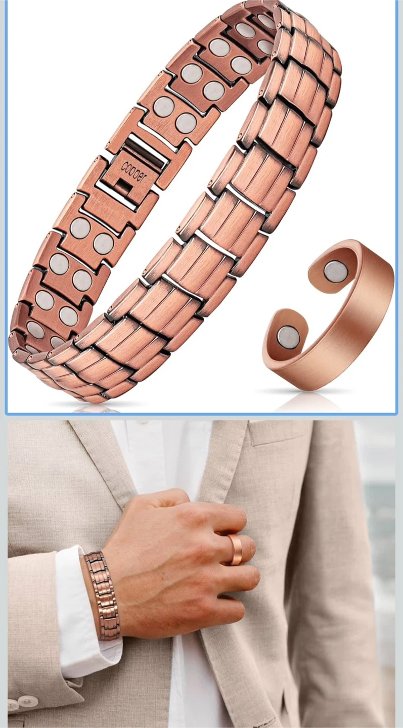 Selling a copper bracelet and matching ring set. The bracelet features a woven design with magnetic closures, and the ring is an adjustable band with magnets as well. A stylish and potentially therapeutic set!