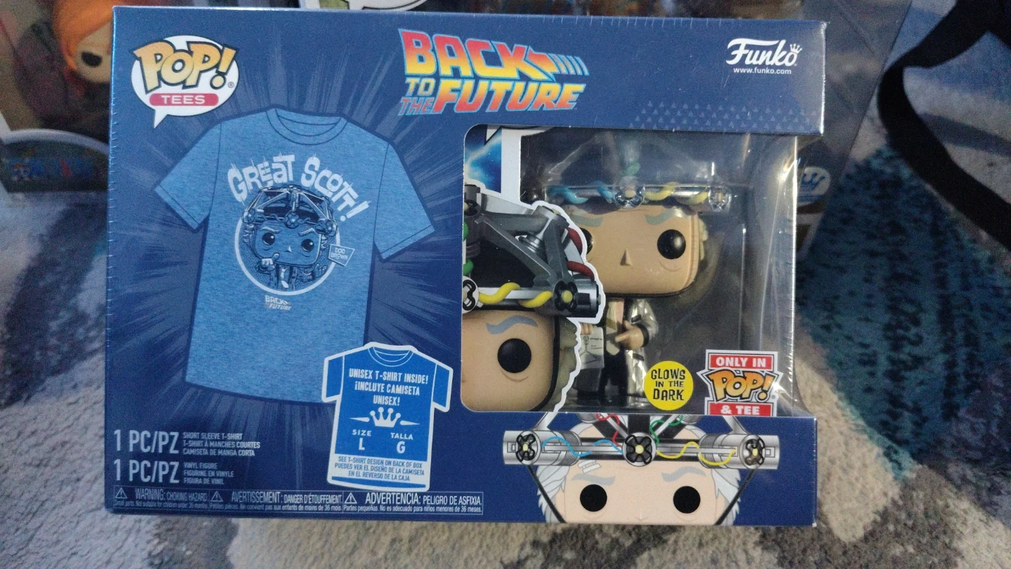 Selling a Funko Pop! set featuring Doc Brown from Back to the Future! This set includes a Doc Brown vinyl figure that glows in the dark and a matching t-shirt. The t-shirt is a unisex size L. The box is included!