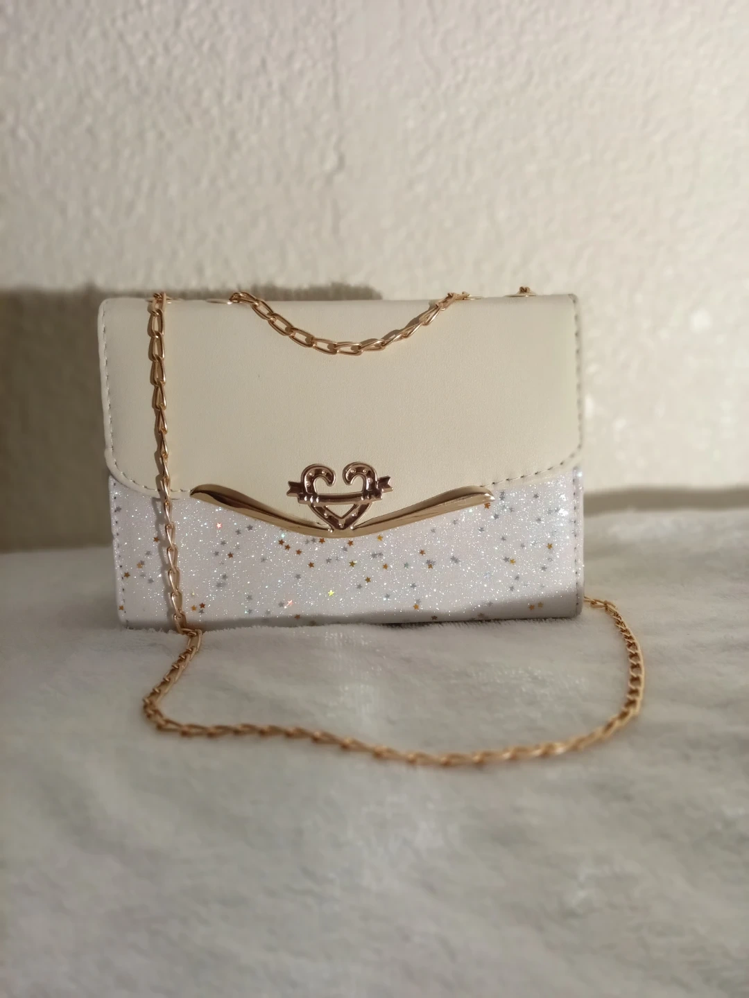 This is a cute little clutch, perfect for a night out or a special occasion! It's white with gold glitter on the bottom half and a gold chain strap. The inside is black. It's in great condition and ready for a new home