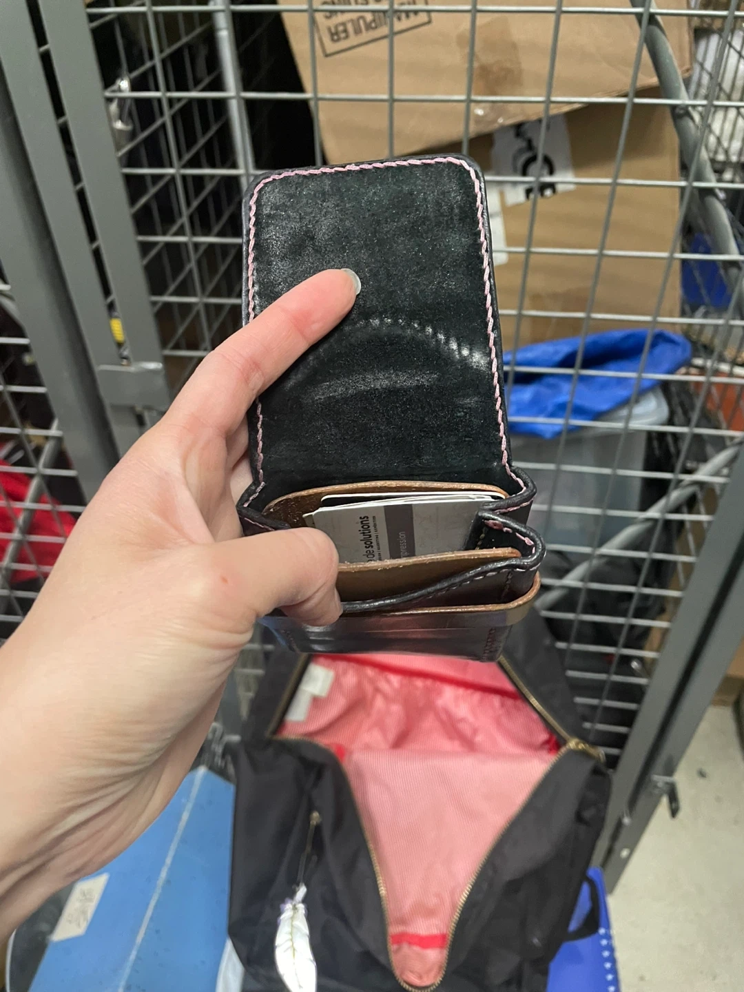 Selling a leather card holder. It has a dark purple/black colour with light pink stitching. It has a brown leather strap.