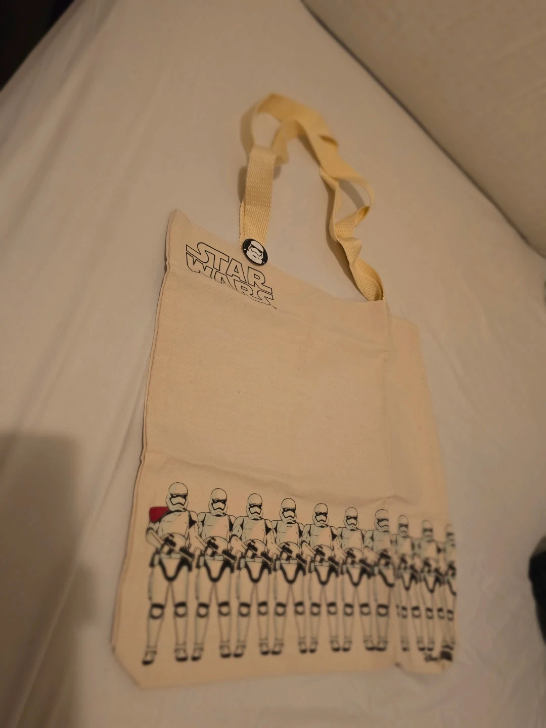 I have a Star Wars tote bag featuring a Stormtrooper design for sale. It's in great shape and perfect for any Star Wars fan!