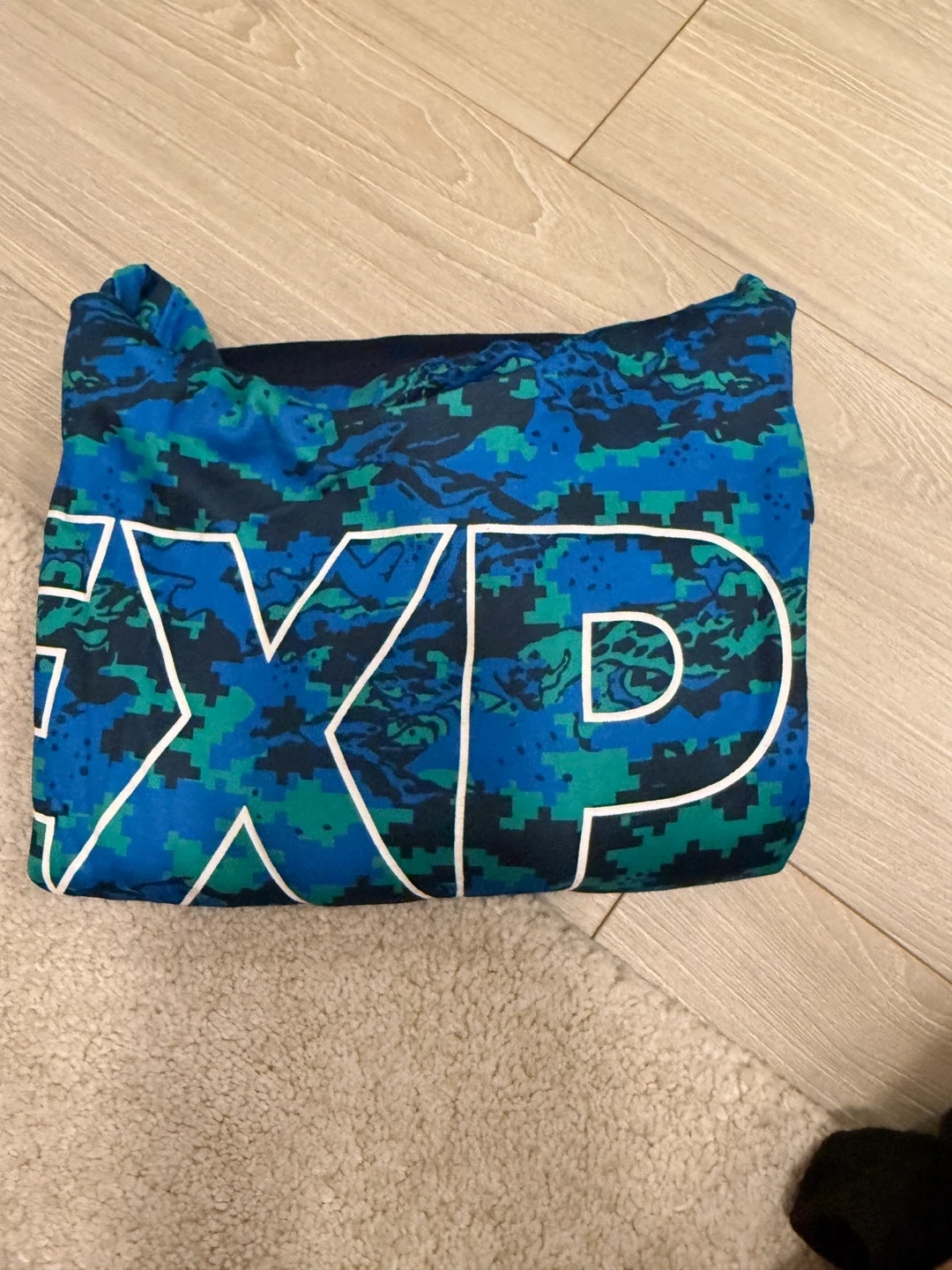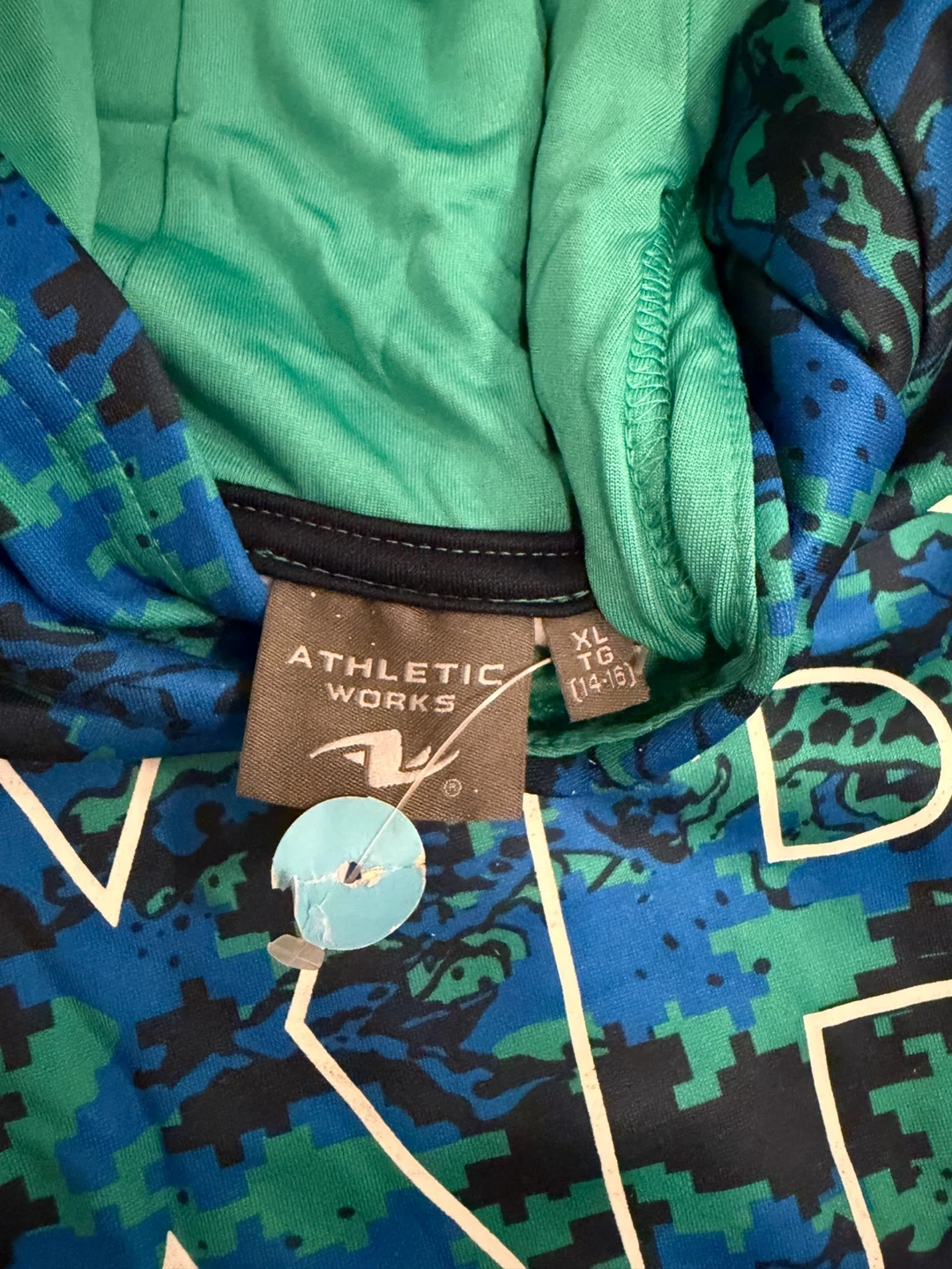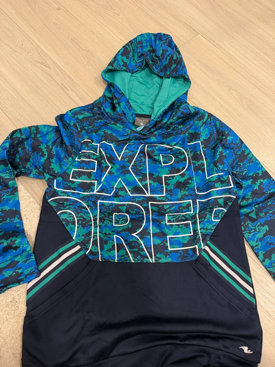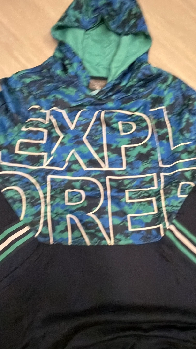 Selling an Athletic Works hoodie in size XL (14-16). It features a cool blue and green camo pattern with the word 'EXPLORE' on the front. Perfect for staying cozy!