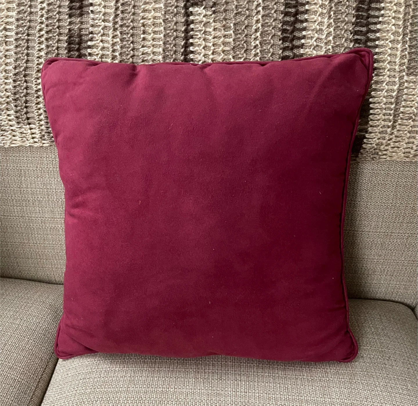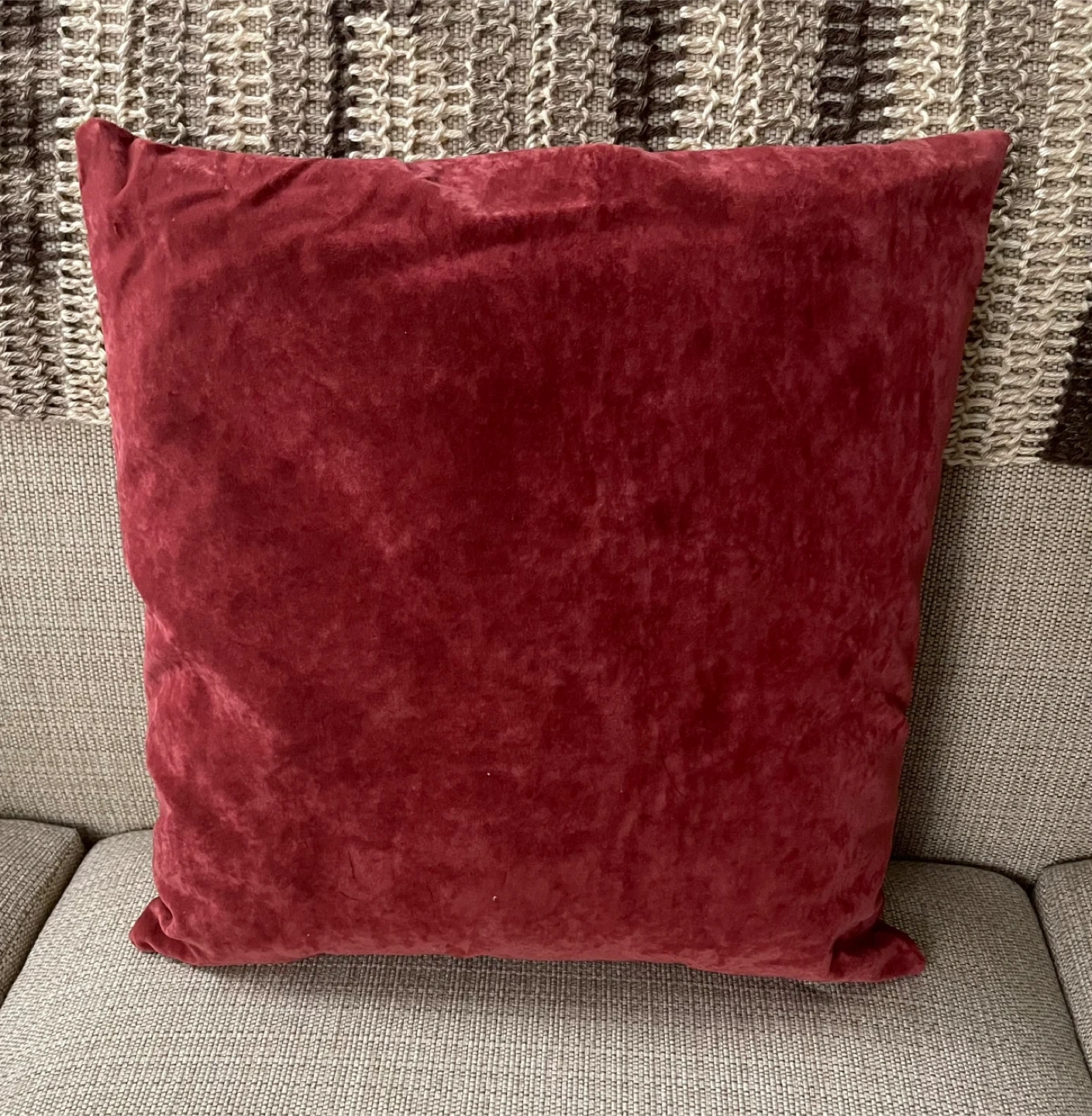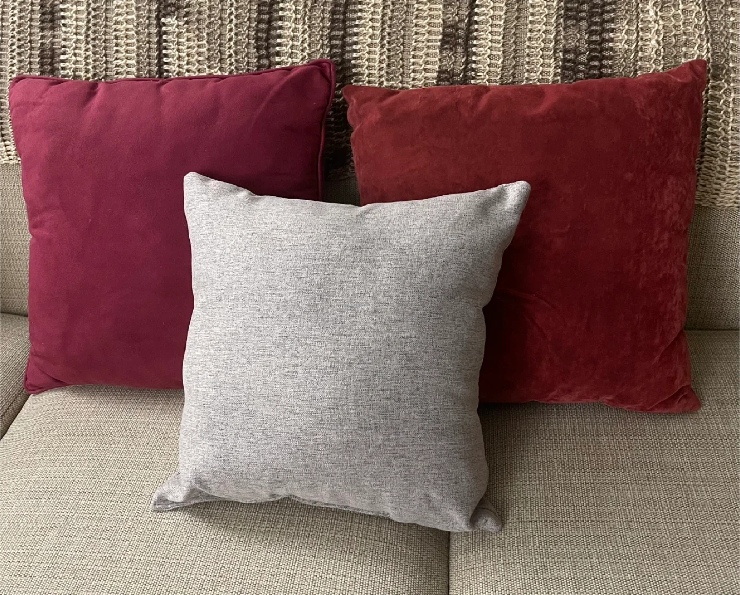 Three square decorative throw pillows (cushions). There are two burgundy cushions and one grey cushion. Durable and good quality material. Perfect for living room or bedroom. Excellent condition. From smoke-free, pest-free, and pet-free home.