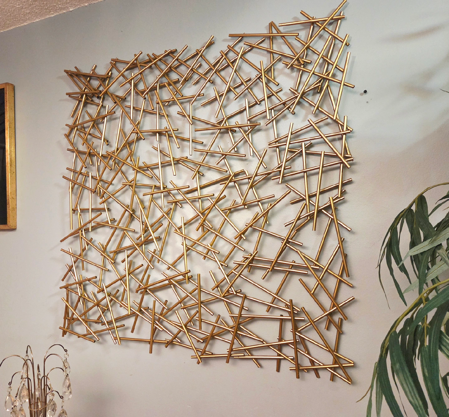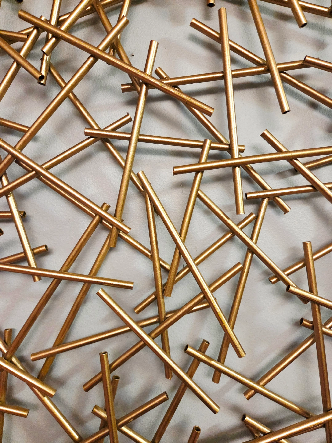 A stack of golden strands to add visual interest to your walls. Made of high-shine metal, it almost looks like a game of pick up sticks, but for the wall. Easy to hang for an instant update to your wall decor.