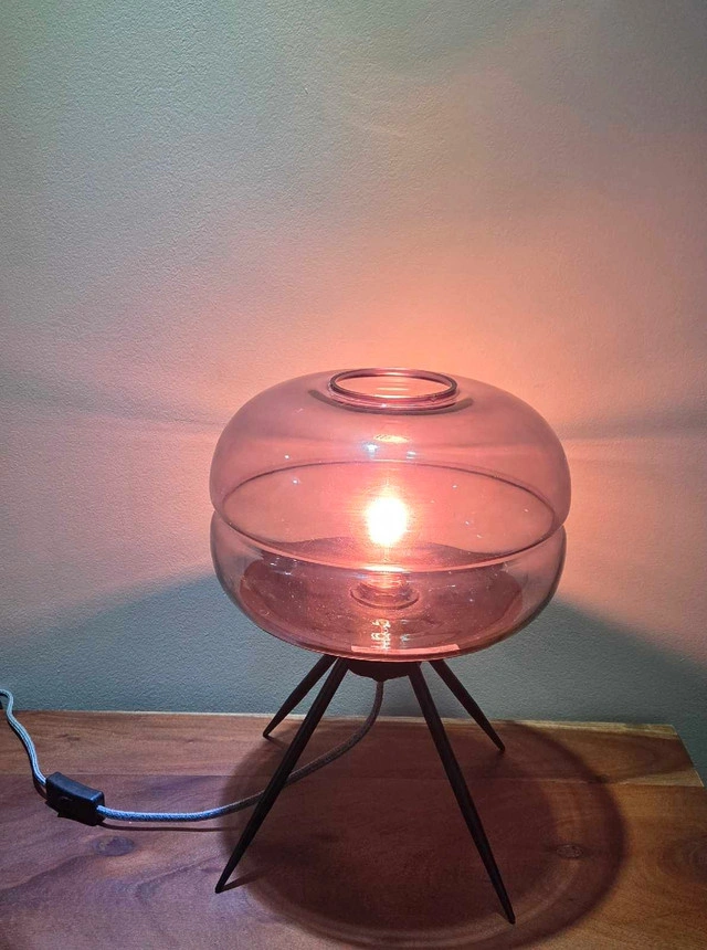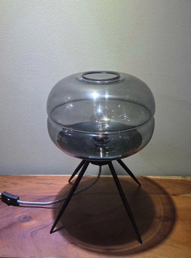 Add a warm, stylish glow to any room with this modern glass table lamp. The clear dome-shaped shade gives off a soft ambient light, perfect for your bedroom, living room, or office. Its sleek black tripod base adds a minimalist touch that fits both contemporary and classic décor. Gently used and in excellent condition Works perfectly — bulb included Easy to clean and set up Ideal for nightstands, desks, or side tables