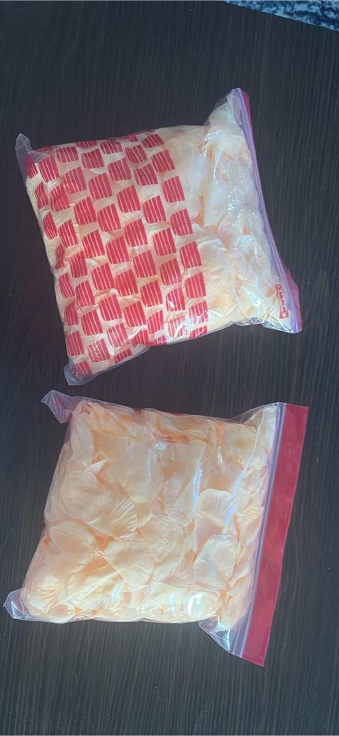 I have three bags of artificial champagne rose petals, perfect for wedding or event decor! They're a lovely peach/champagne colour and ready to add a touch of elegance to your special occasion