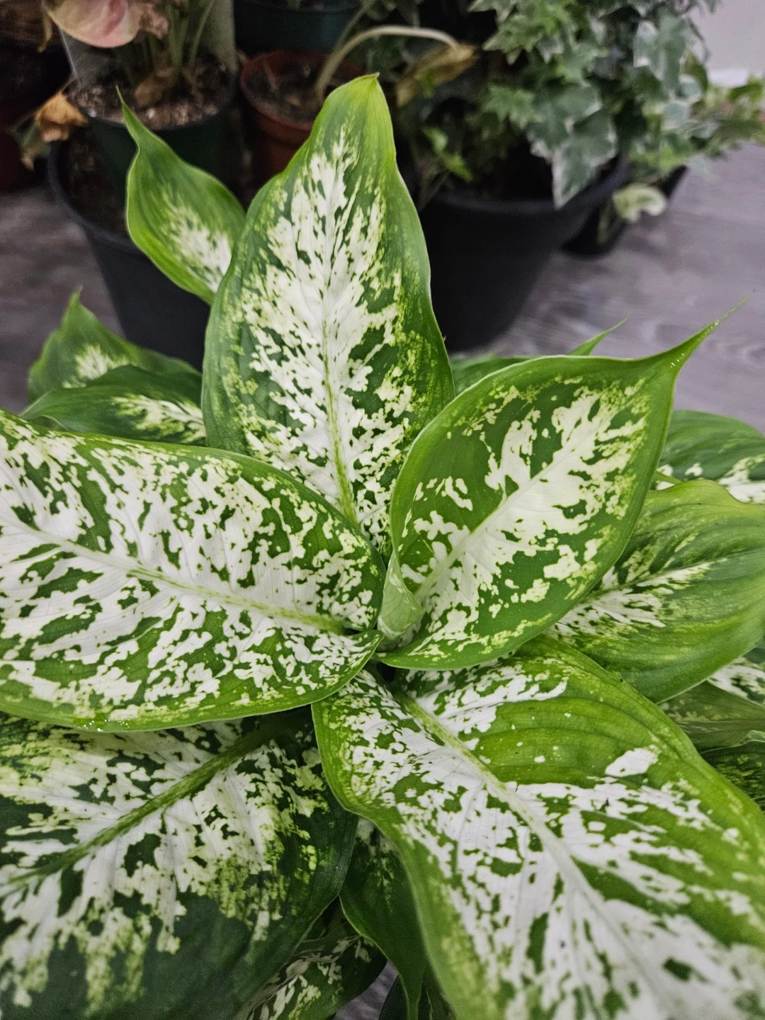 694Selling a beautiful Dieffenbachia plant! It has lovely green and white variegated leaves and comes in a black pot. It's a great way to add some life to your space