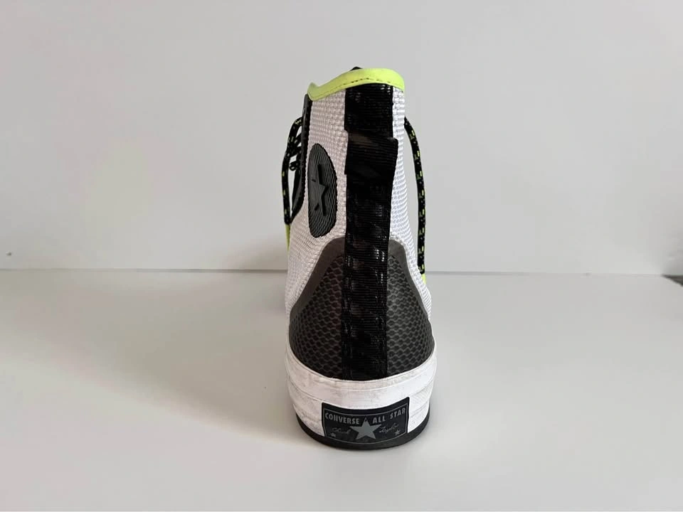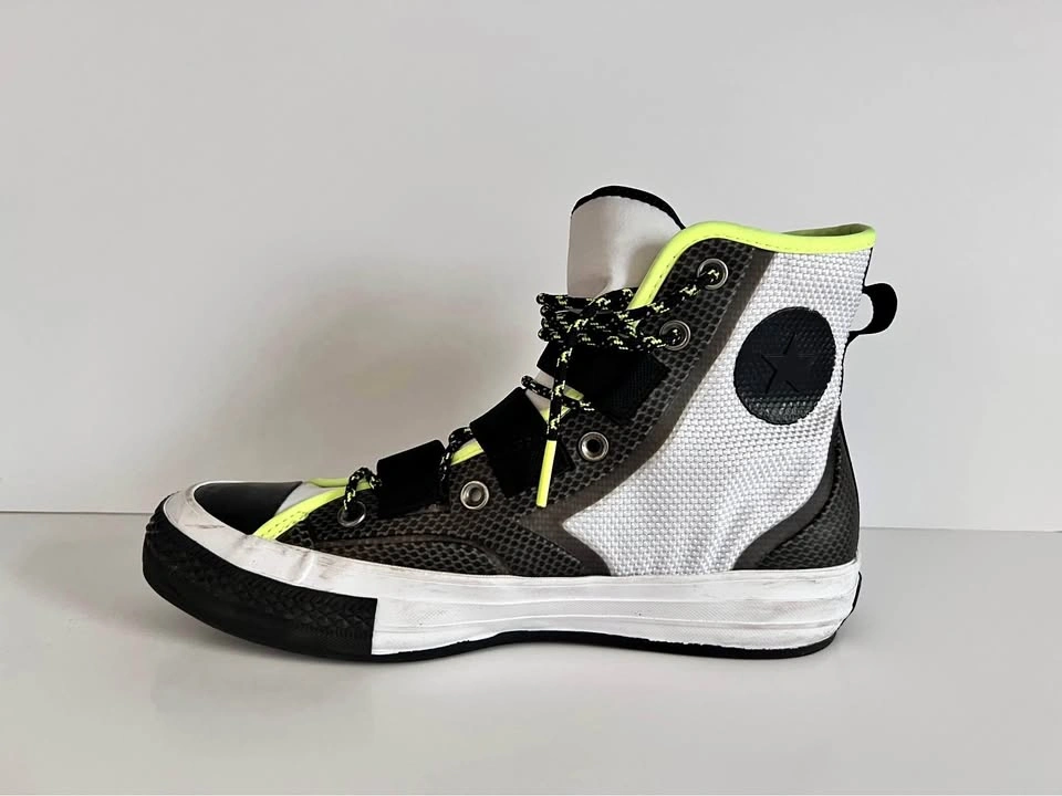 Converse All Star CX Utility in black, white, and neon yellow. Men’s size 8.5. Unique hybrid design with strap accents and reflective details. Lightly worn, clean, and super comfy.