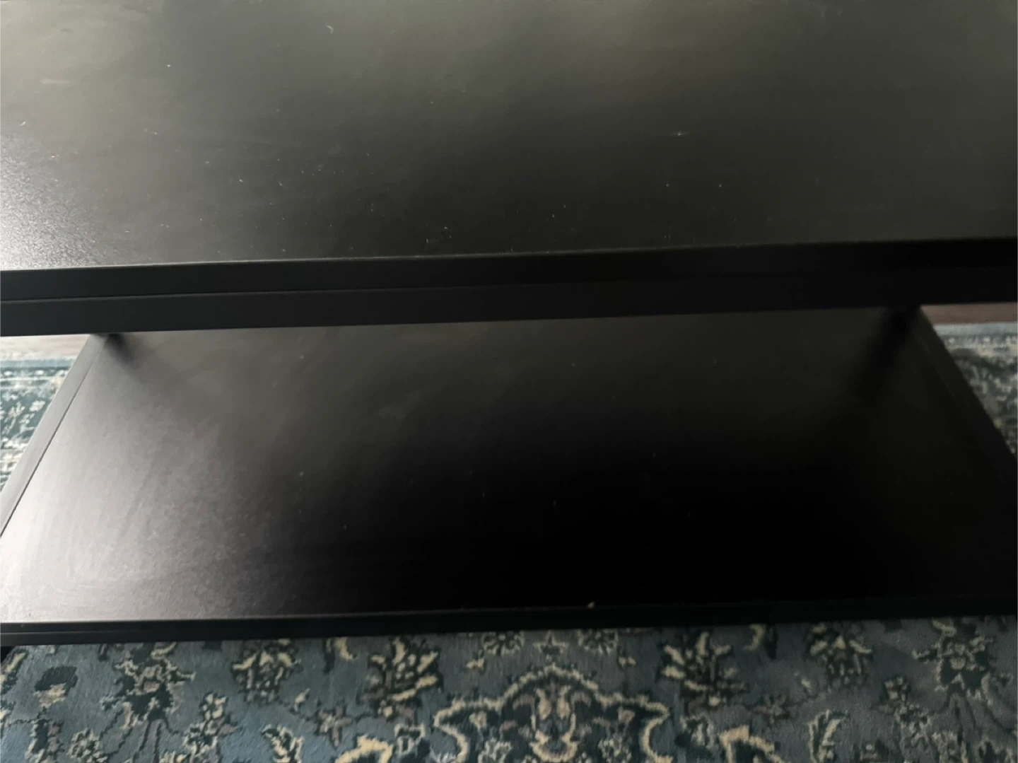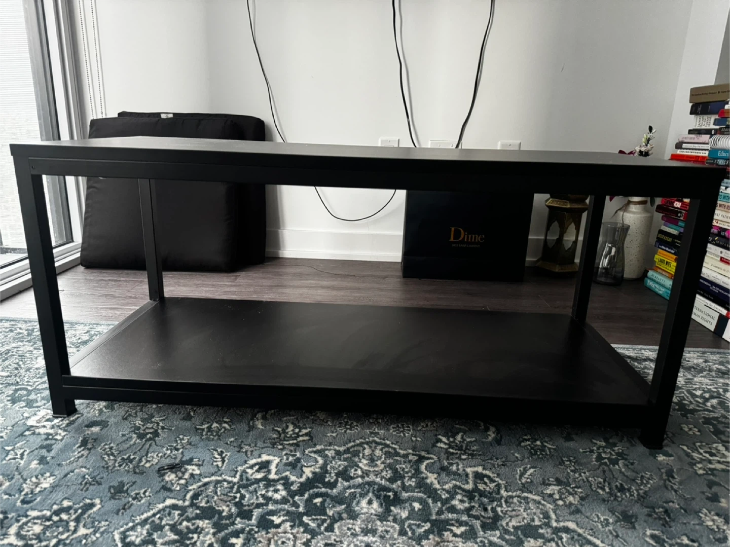 Selling a simple black coffee table. It has a shelf underneath for extra storage or decor. Great for any living room!