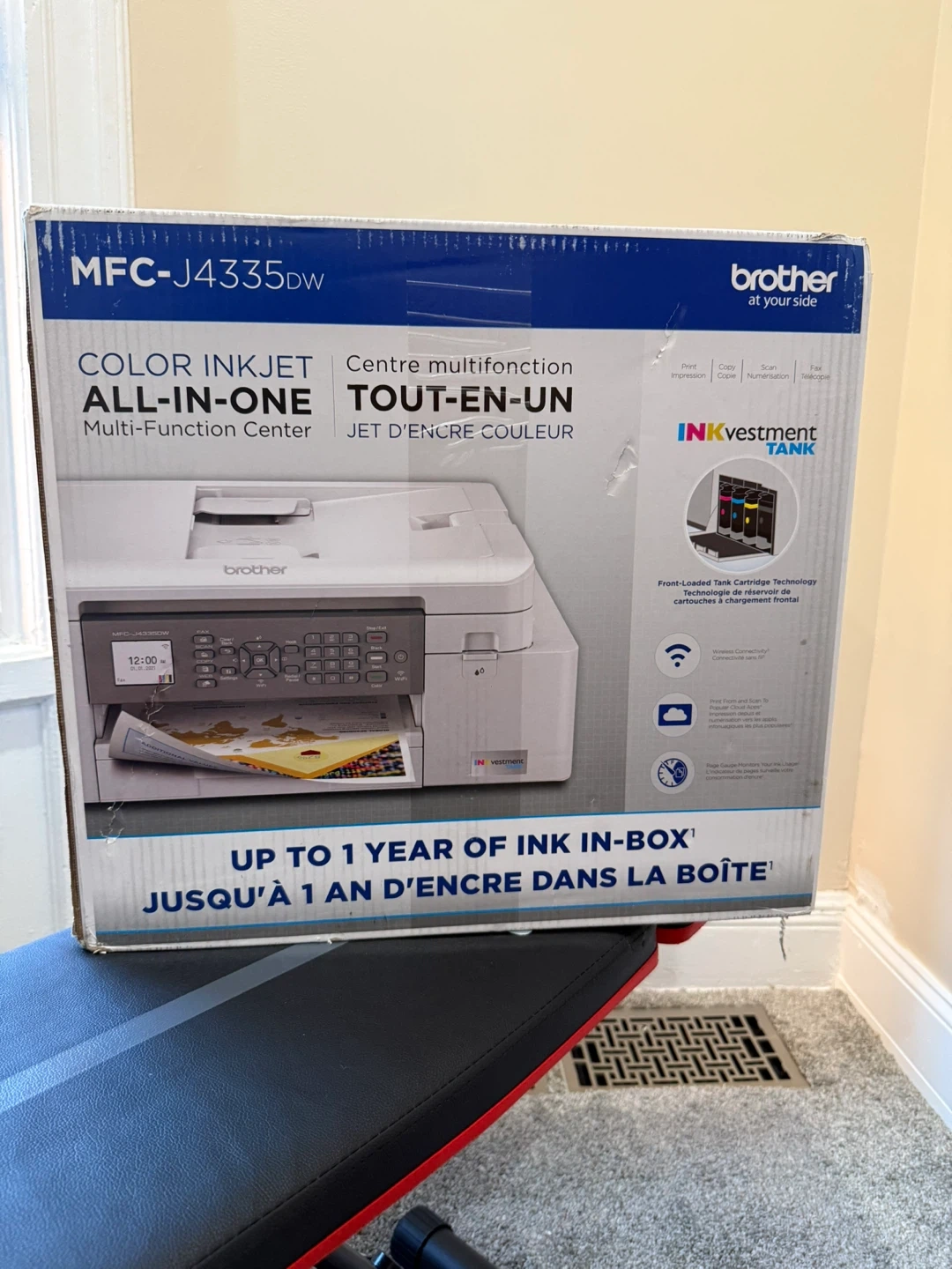 Selling a Brother MFC-J4335DW all-in-one color inkjet printer. This multi-function center is perfect for home or office use. It features inkvestment tank technology, so you get up to 1 year of ink in the box! It's compatible with Windows and has Wi-Fi direct for easy wireless printing from your devices
