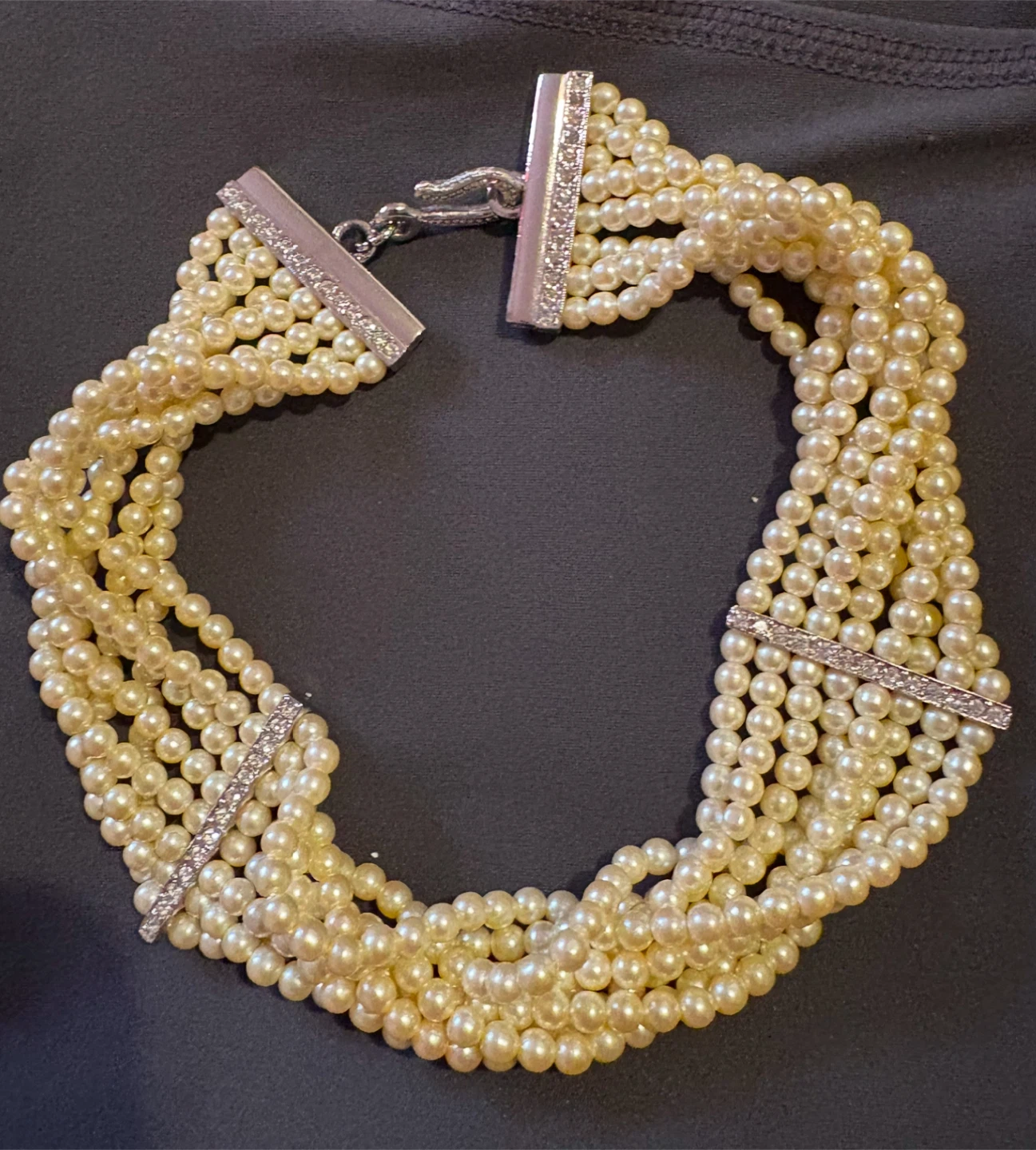 Selling a beautiful pearl necklace! It's in great condition and features multiple strands of pearls, adding a touch of elegance to any outfit