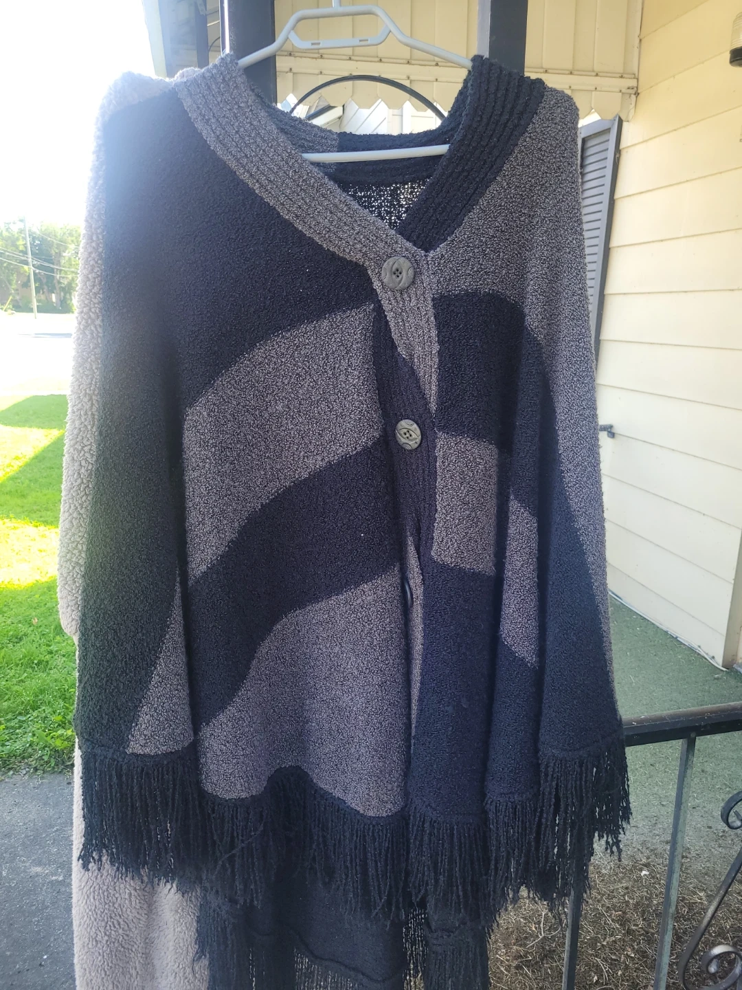 Selling a cozy poncho with a stylish striped pattern in shades of grey and black. It features a fringed hem and a two-button closure at the front. Perfect for adding a layer of warmth on chilly days!