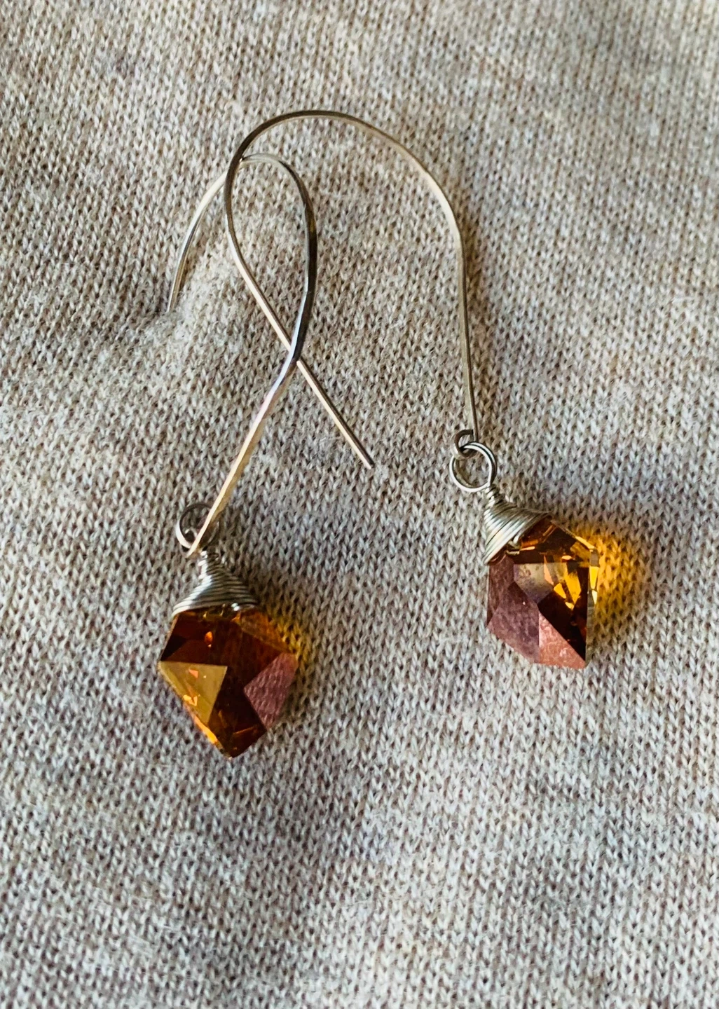 Selling a pair of handmade drop earrings. They feature a beautiful amber-coloured crystal. The earrings have silver hooks and are in great condition!