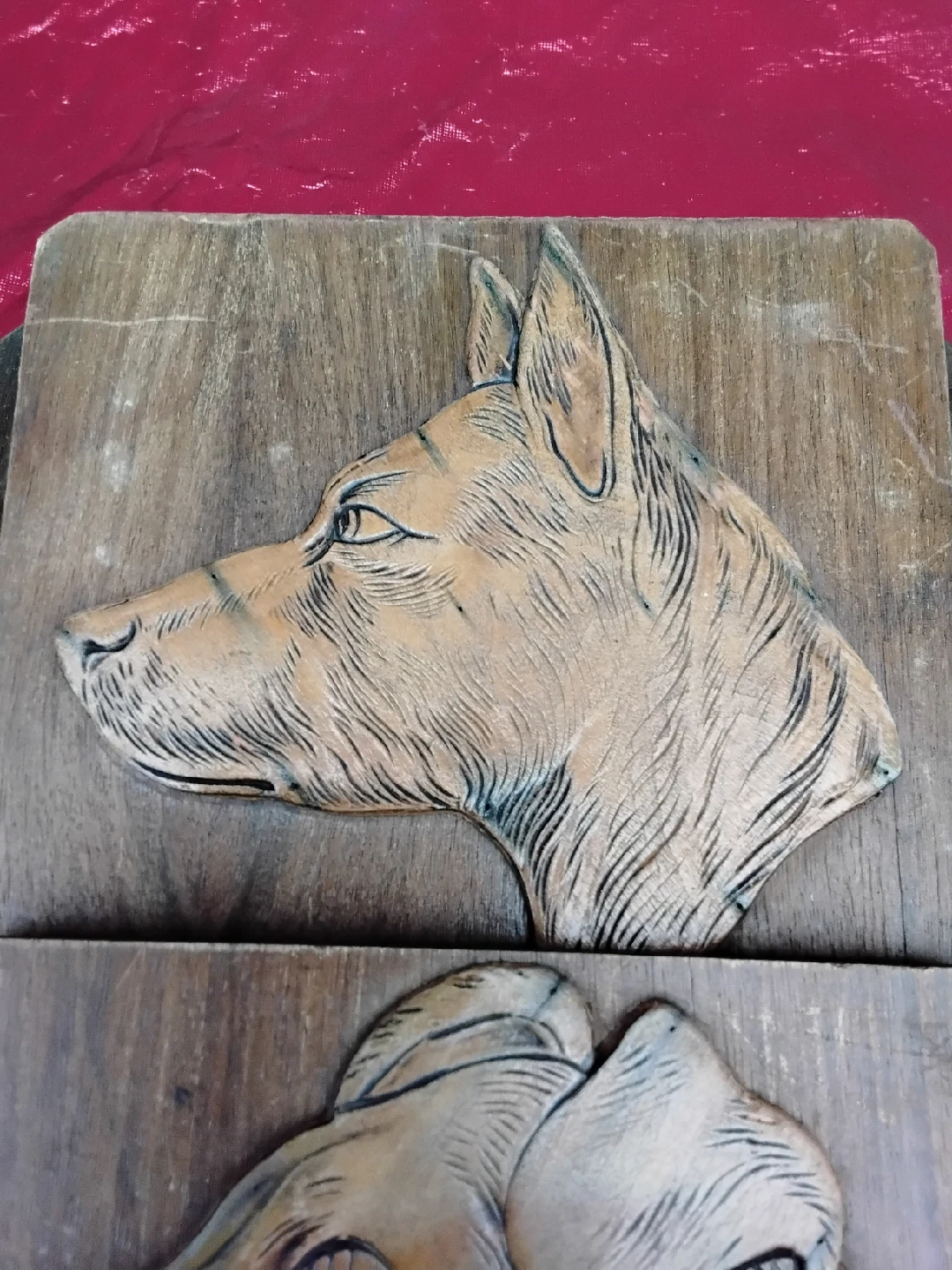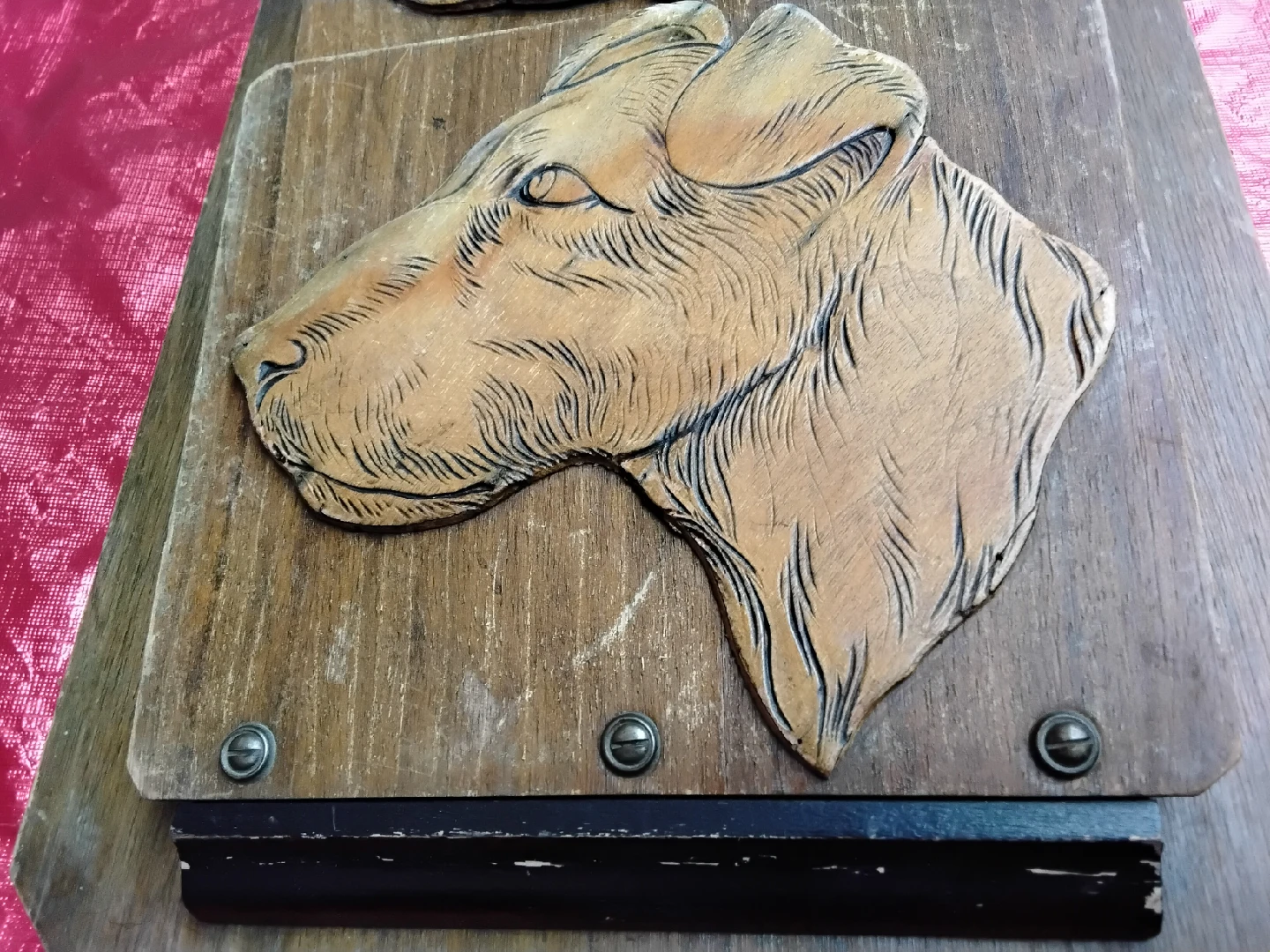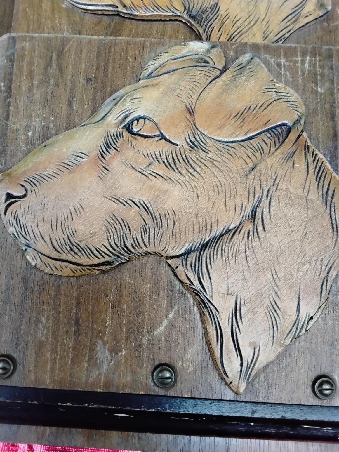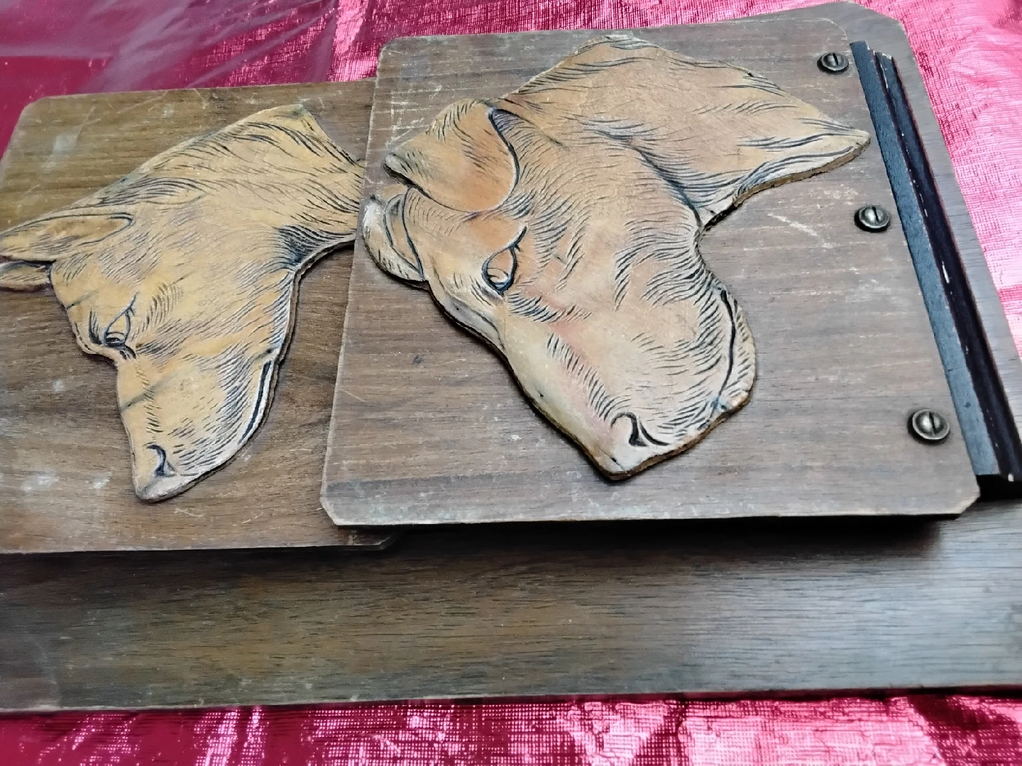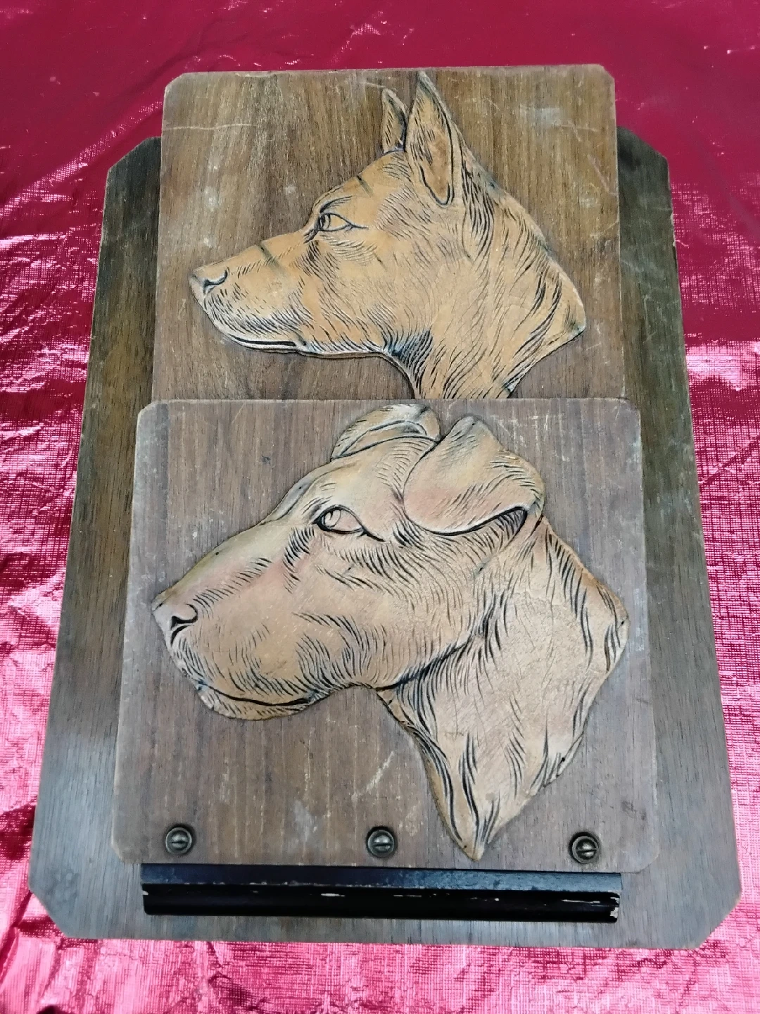 Selling a VINTAGE piece of wooden wall art featuring carved dog heads. It's a unique and charming item that would add character to any room. The rustic wood has a lovely warm tone, and the carvings are detailed. Perfect for dog lovers or anyone who appreciates vintage decor!