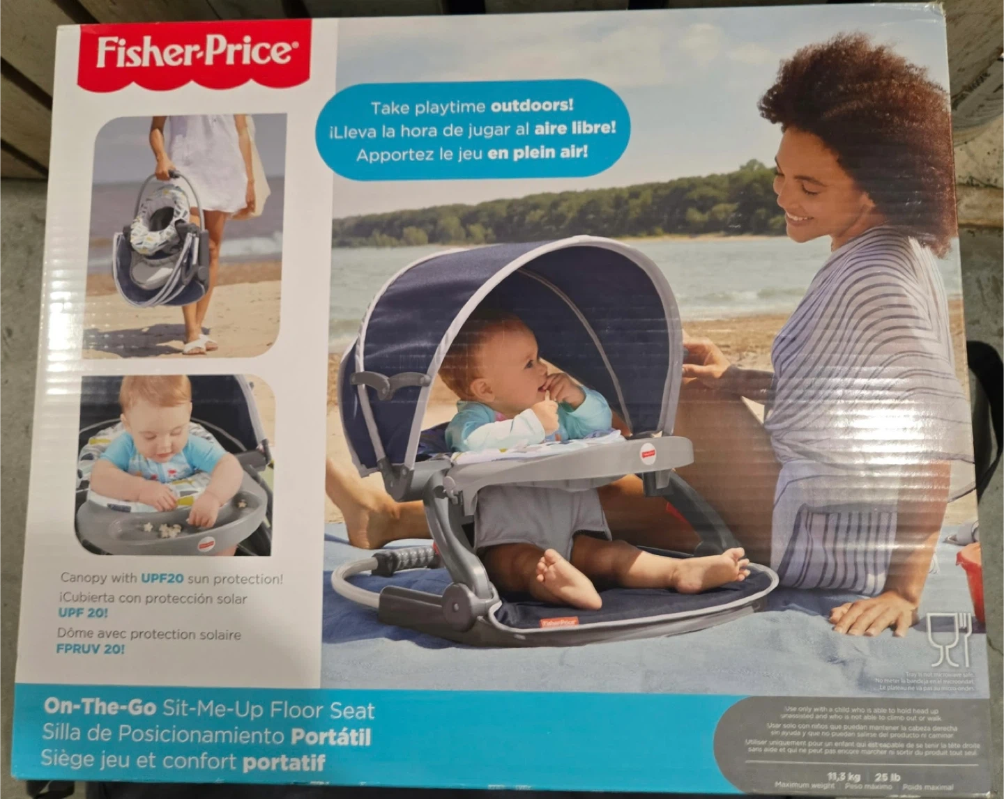 This Fisher-Price On-The-Go Sit-Me-Up Floor Seat is perfect for taking playtime outdoors! It features a canopy with UPF20 sun protection to keep your little one safe from the sun. It's designed for use only with a child who is able to hold their head up unassisted and who is not able to climb out or walk. Maximum weight is 25 lbs.