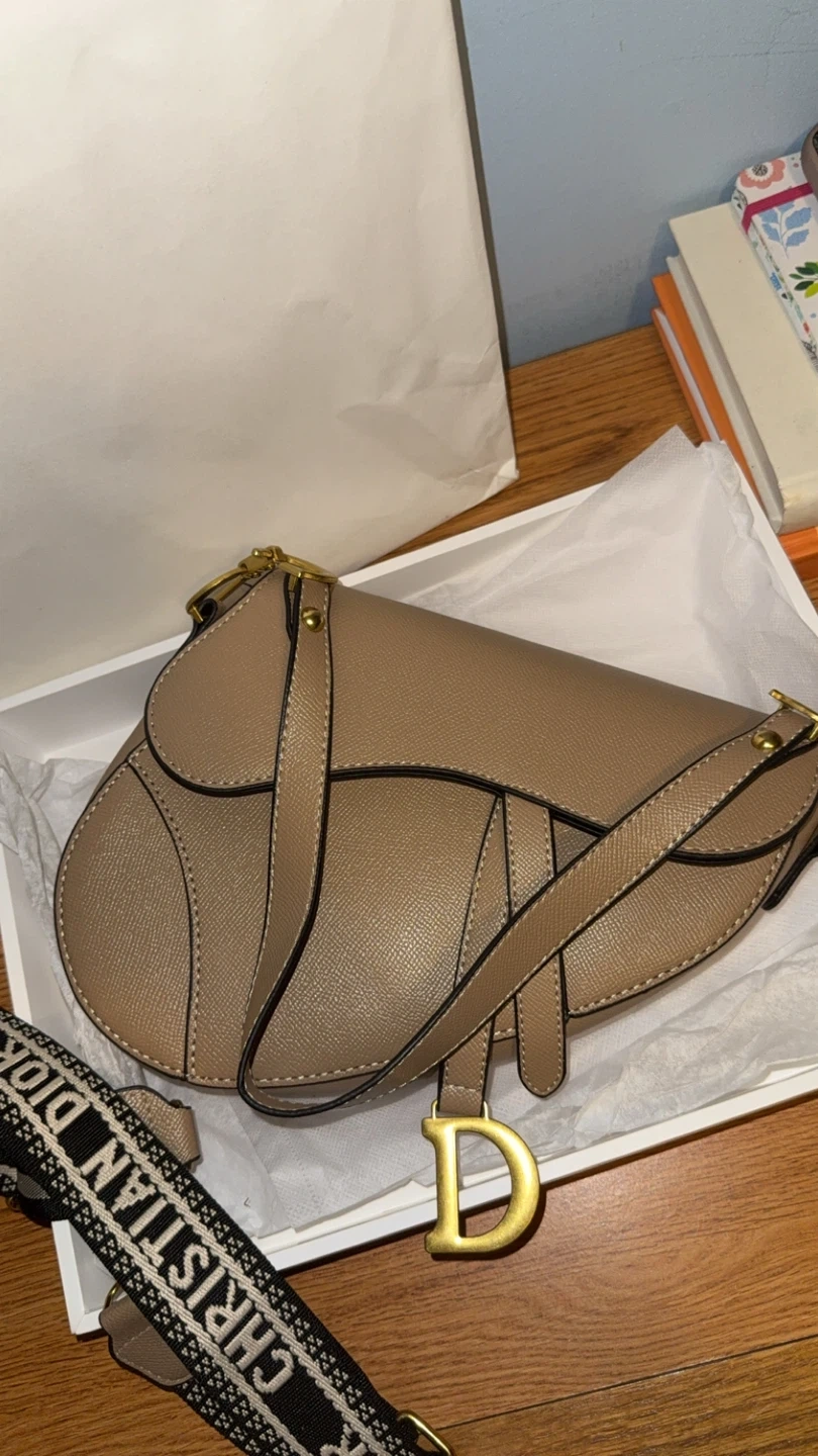 Selling a Dior Saddle Bag in a beautiful grain colour. The bag also features the iconic 'CD' logo and 'Christian Dior' strap detailing. It's in great condition and ready for a new home!