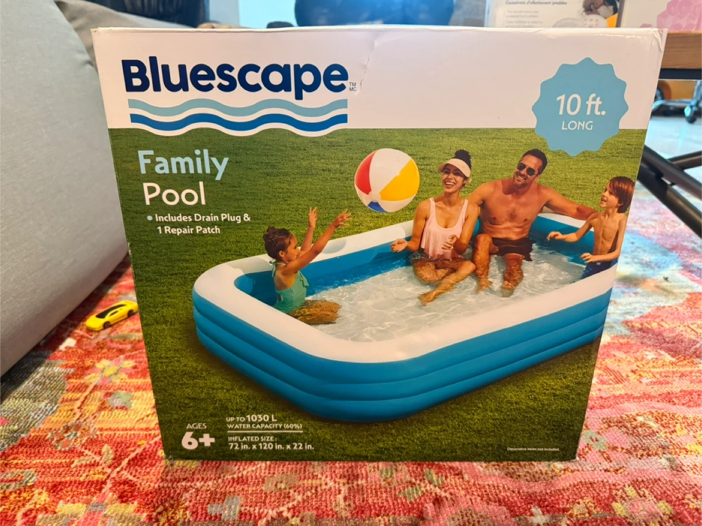 Selling a brand new Bluescape Family Pool, still in its original box! It's 10 ft long and comes with a drain plug and a repair patch. The inflated size is 72 in x 120 in x 22 in, and it holds up to 1030 L of water. Recommended for ages 6+