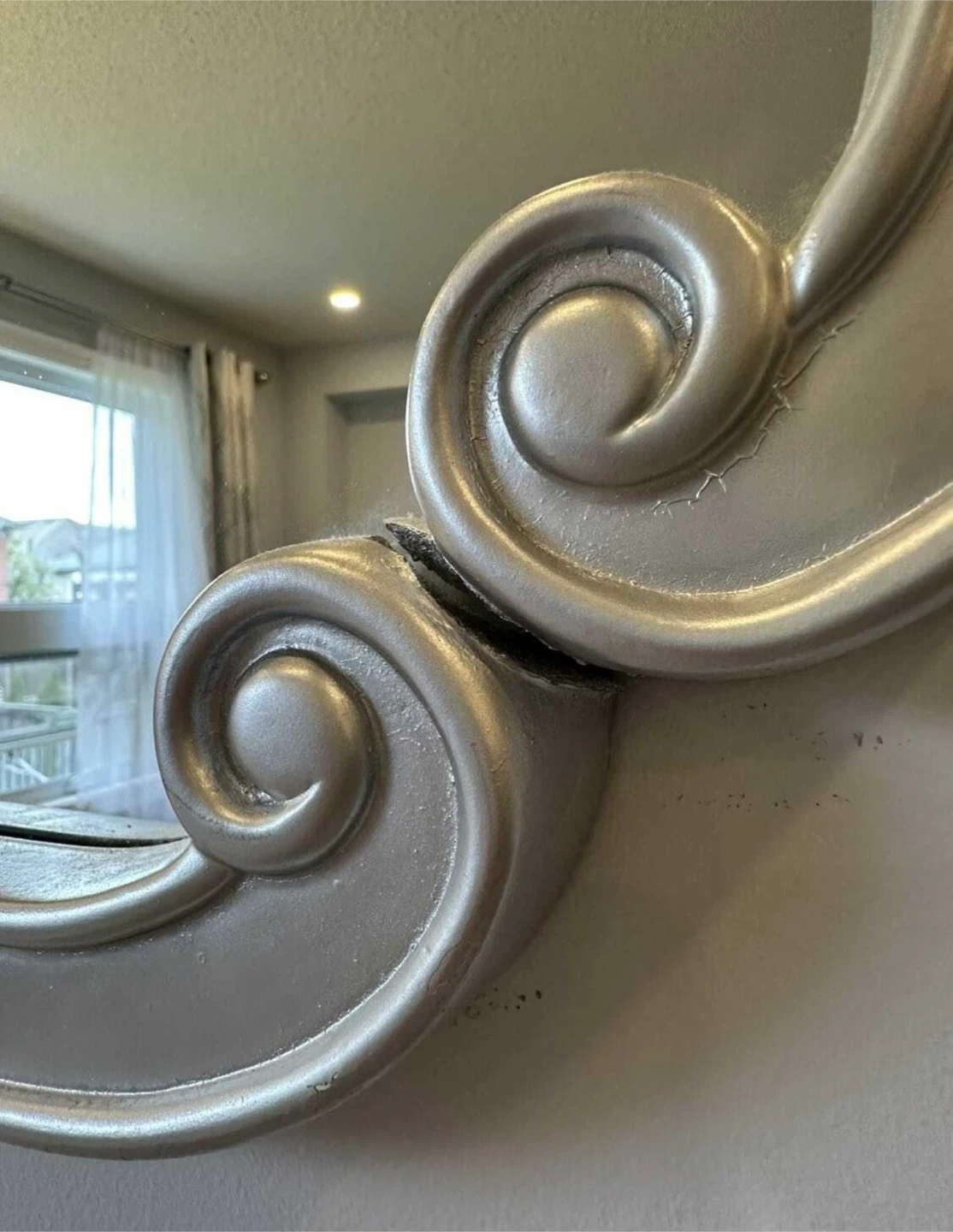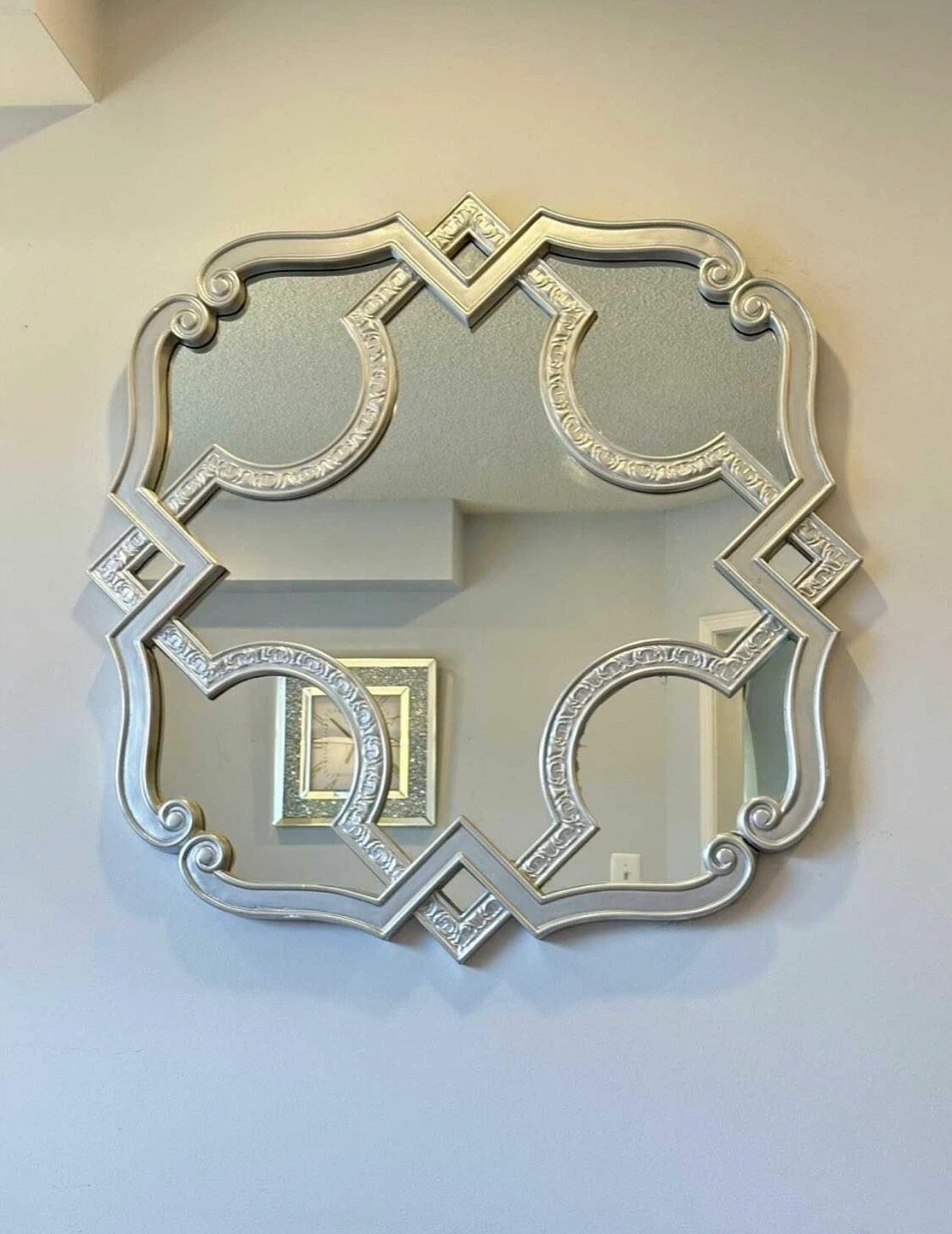 Selling a decorative wall mirror in silver. It has a unique, ornate design that would add a touch of elegance to any room. Large wall accent painted mirror,small crack easily can be fix .36 inches