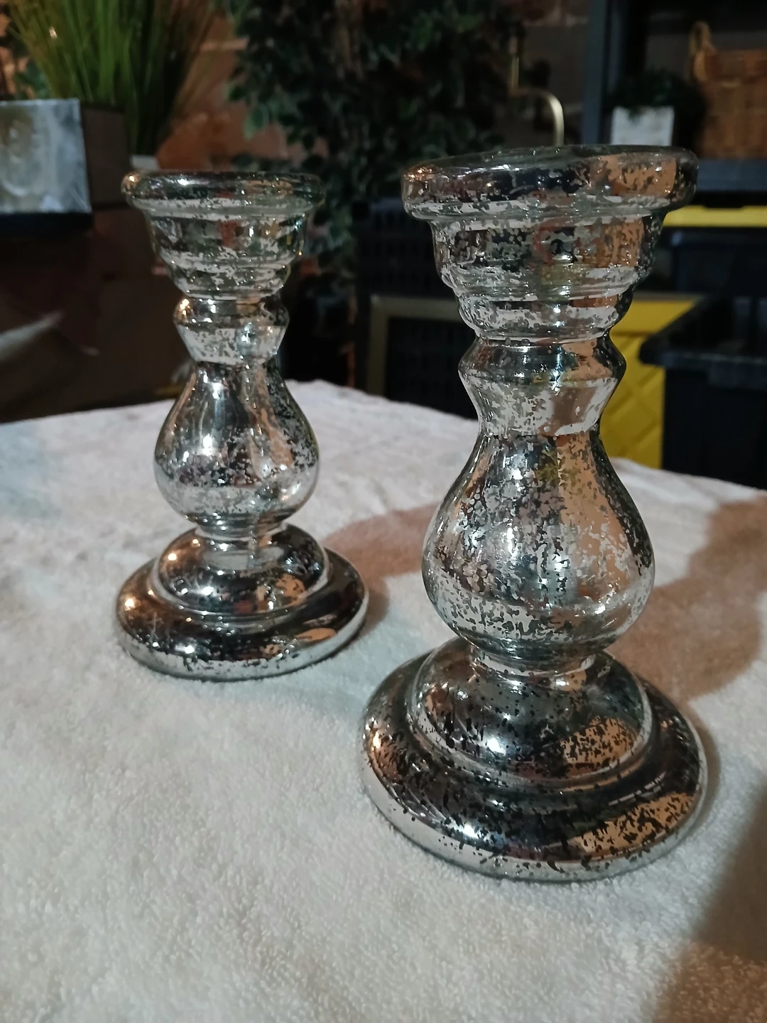 Selling a set of two silver mercury glass candlestick holders. They add a touch of elegance to any space and are in great condition. Perfect for creating a cozy atmosphere!