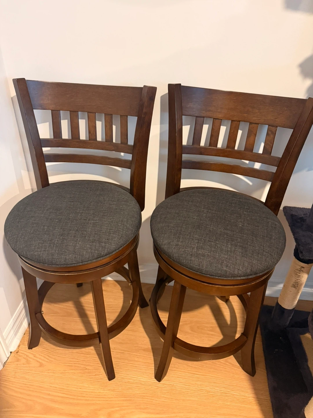 Selling a set of two swivel bar stools. They're in great shape and would look great in any kitchen or bar area. The stools have a dark wood finish and a comfortable grey fabric seat.