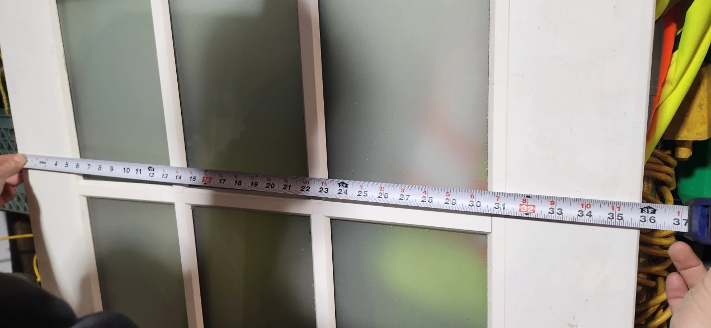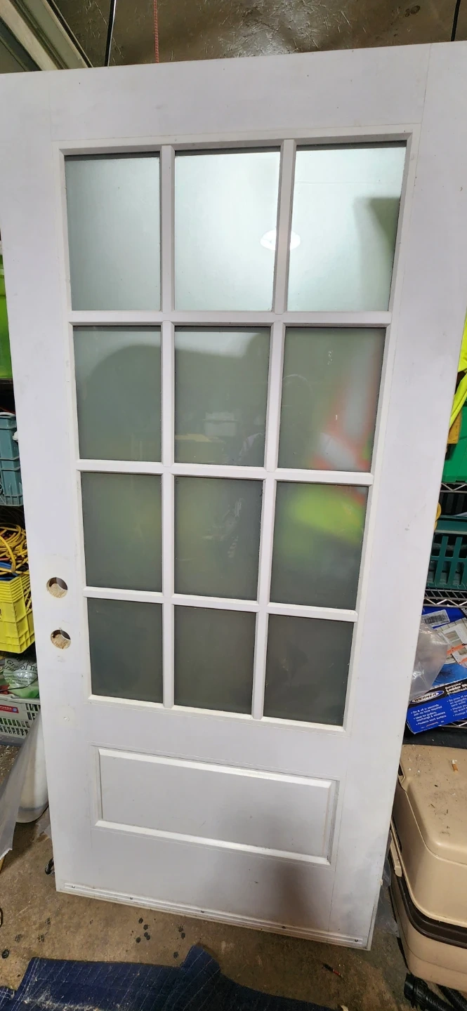 Selling a white door with frosted glass. It measures approximately 79 inches tall and 36 inches wide. Perfect for adding privacy while still letting in light