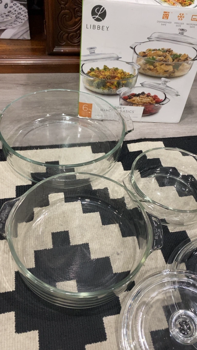 Selling a Libbey Baker's Basics 6-piece bake set! This set is perfect for all your baking needs. It includes three different sized glass baking dishes and three lids. The box indicates that the dishes are dishwasher, freezer, microwave, and oven safe!