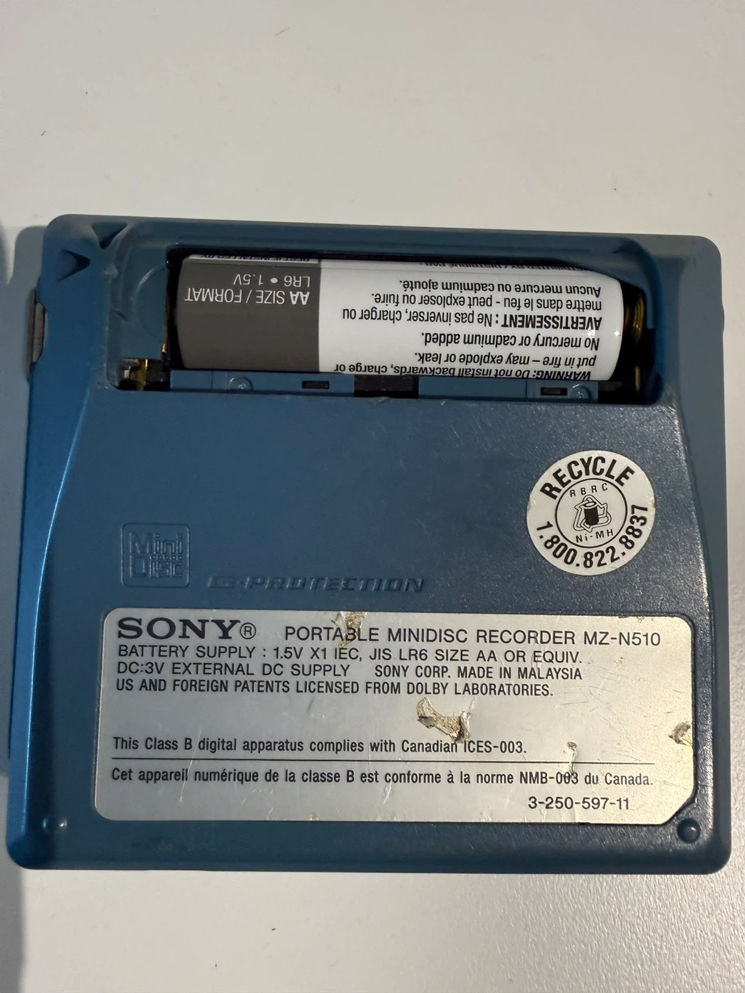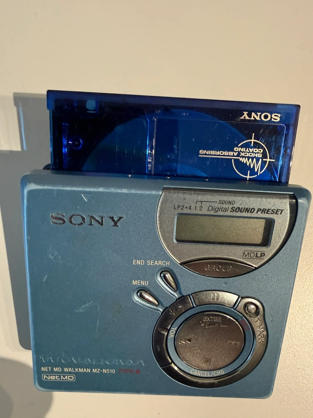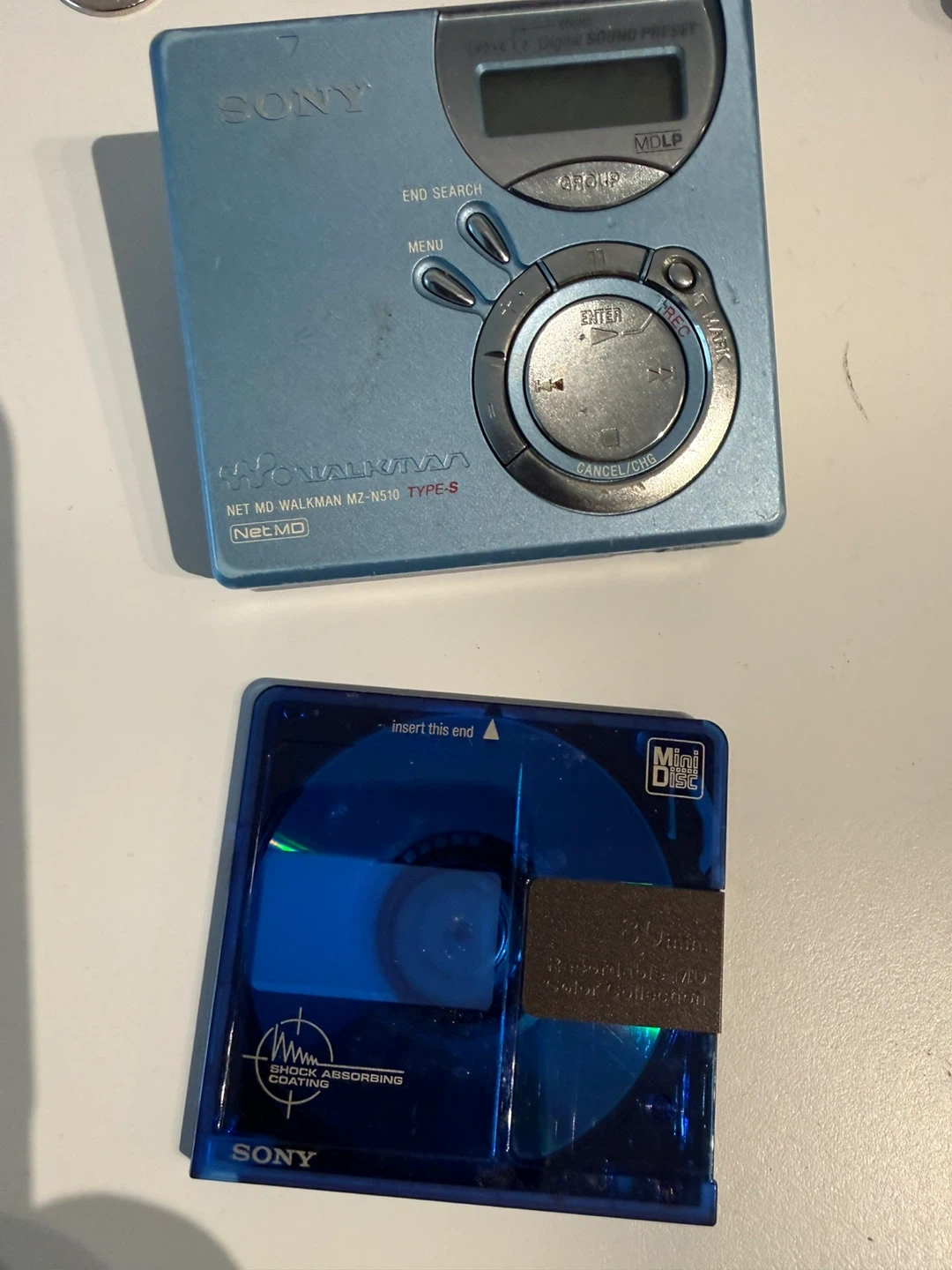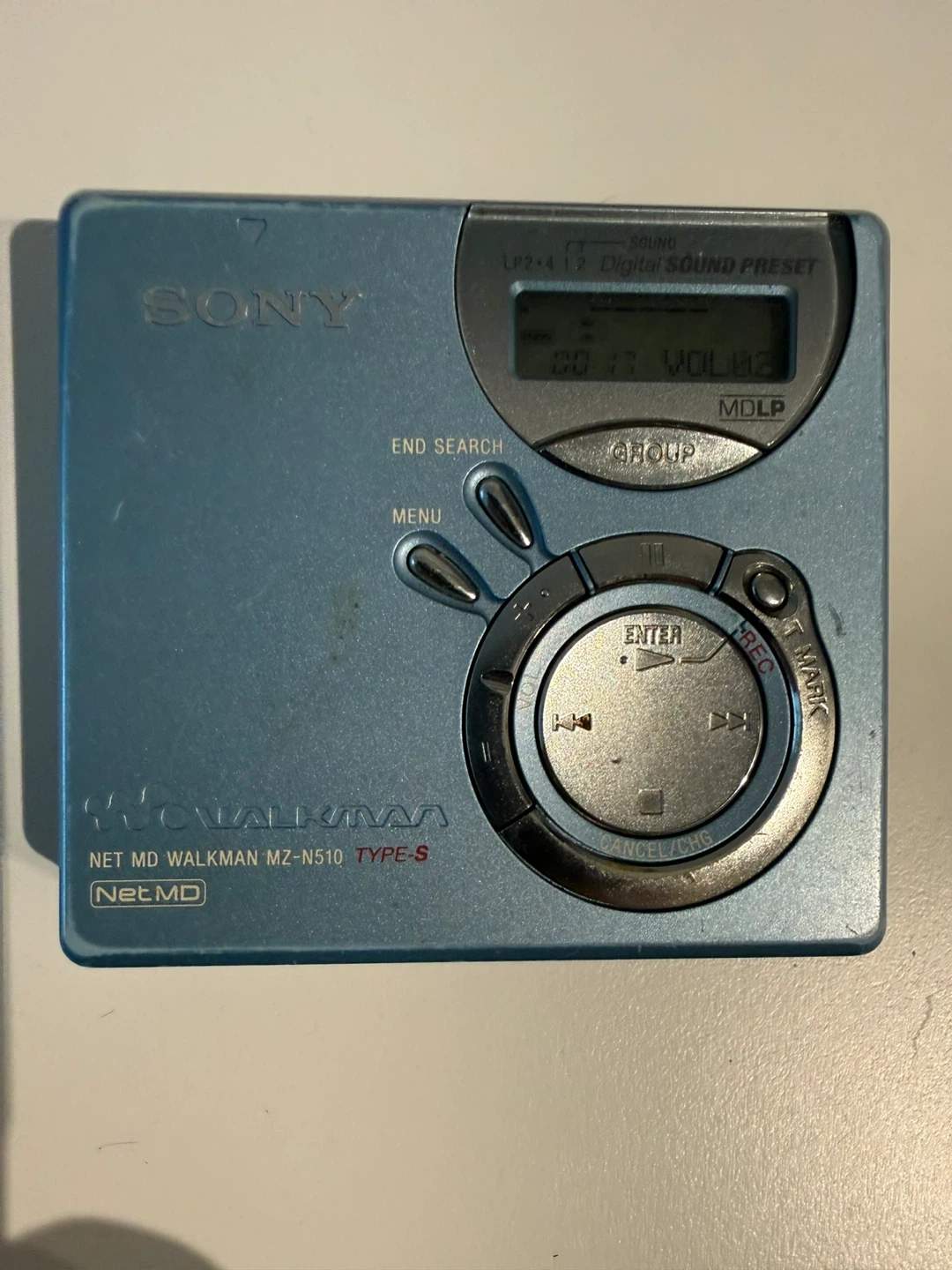 65Selling a used Sony Net MD Walkman MZ-N510 Type-S in blue. It's a portable minidisc recorder that uses a single AA battery. Also included is a Sony minidisc.