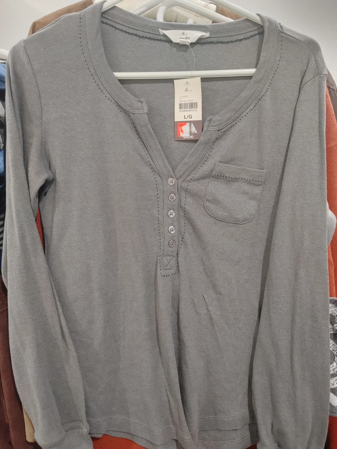 1000+🧡COTTON GINNY HENLEY 🧡BRAND NEW WITH TAGS 🧡WOMENS SIZE LARGE 🧡COLOUR IS CONCRETE 🧡I AM LOCATED IN THE YONGE AND STEELES AREA FOR PICKUP.