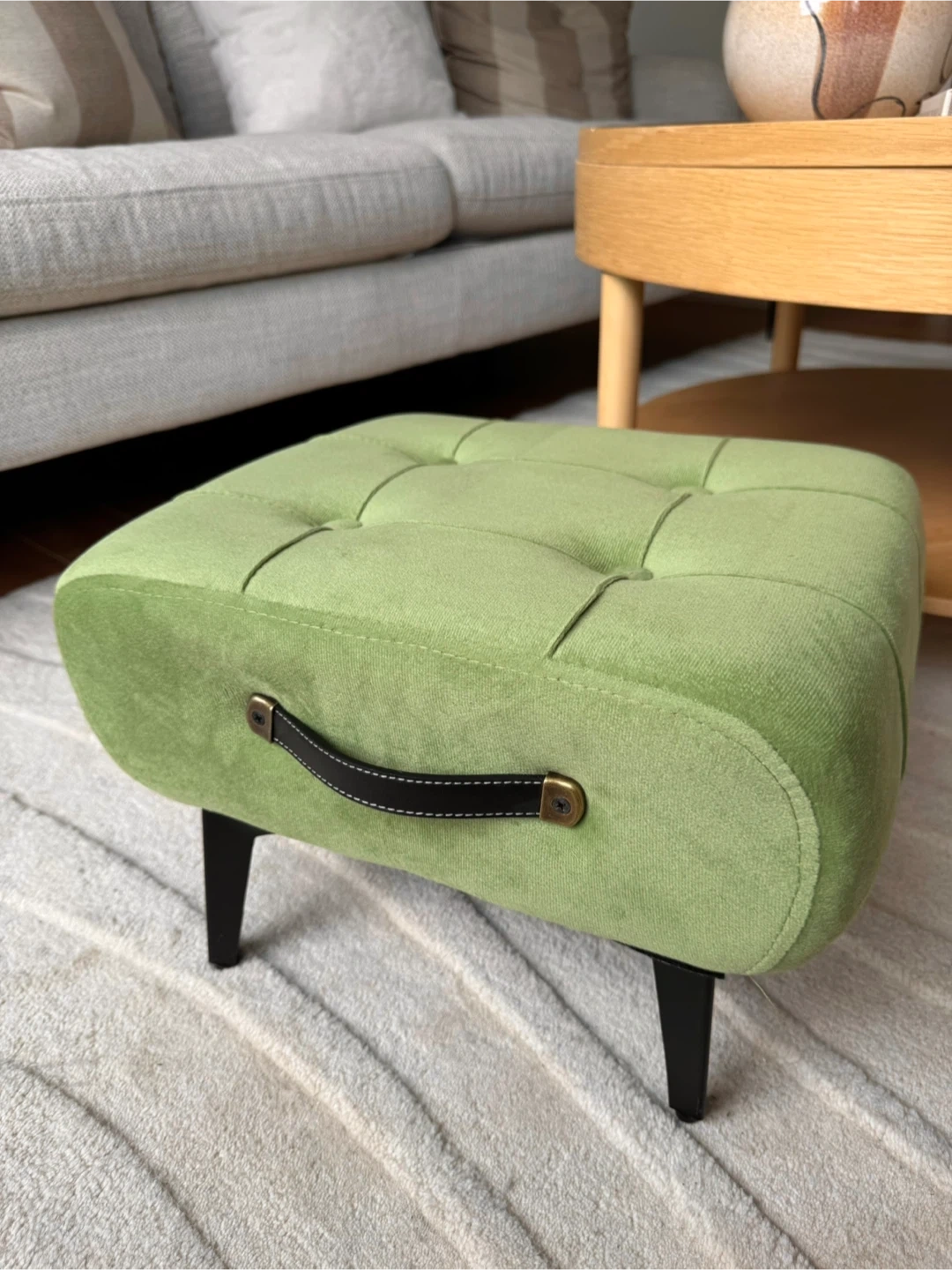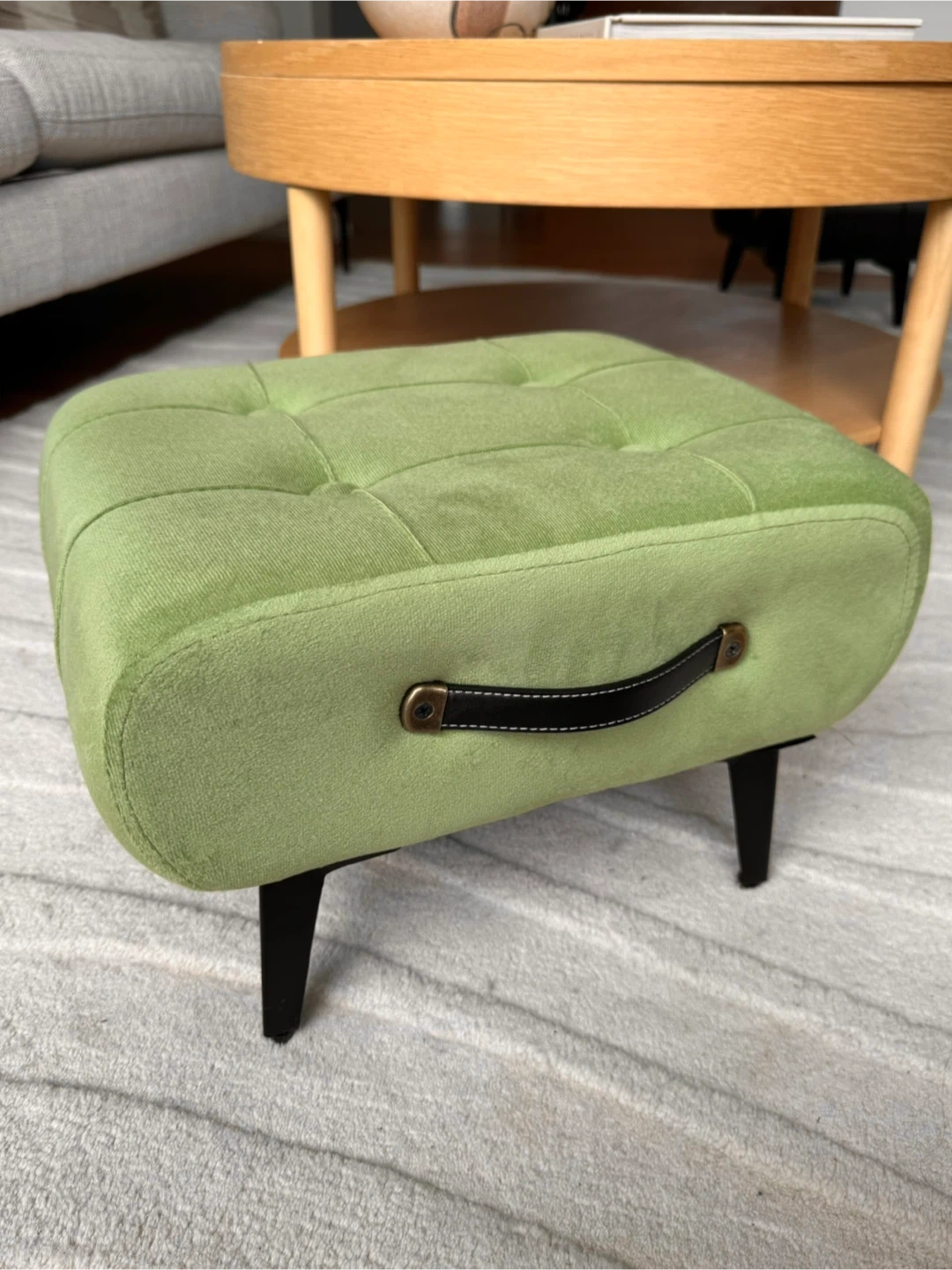 Selling cute green velvet ottoman footstool! It's in great shape and perfect for adding a pop of colour to your living space. The dimensions are 41cm length, 34cm width, and 25cm height. It features a stylish handle detail as well