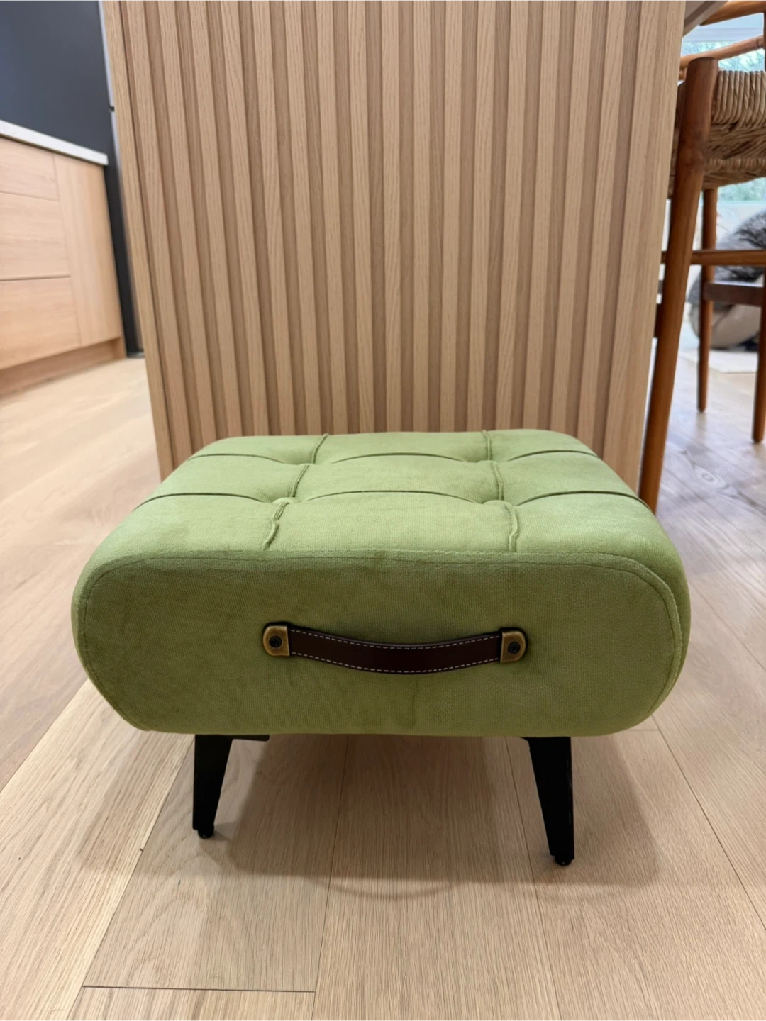 Selling cute green velvet ottoman footstool! It's in great shape and perfect for adding a pop of colour to your living space. The dimensions are 41cm length, 34cm width, and 25cm height. It features a stylish handle detail as well