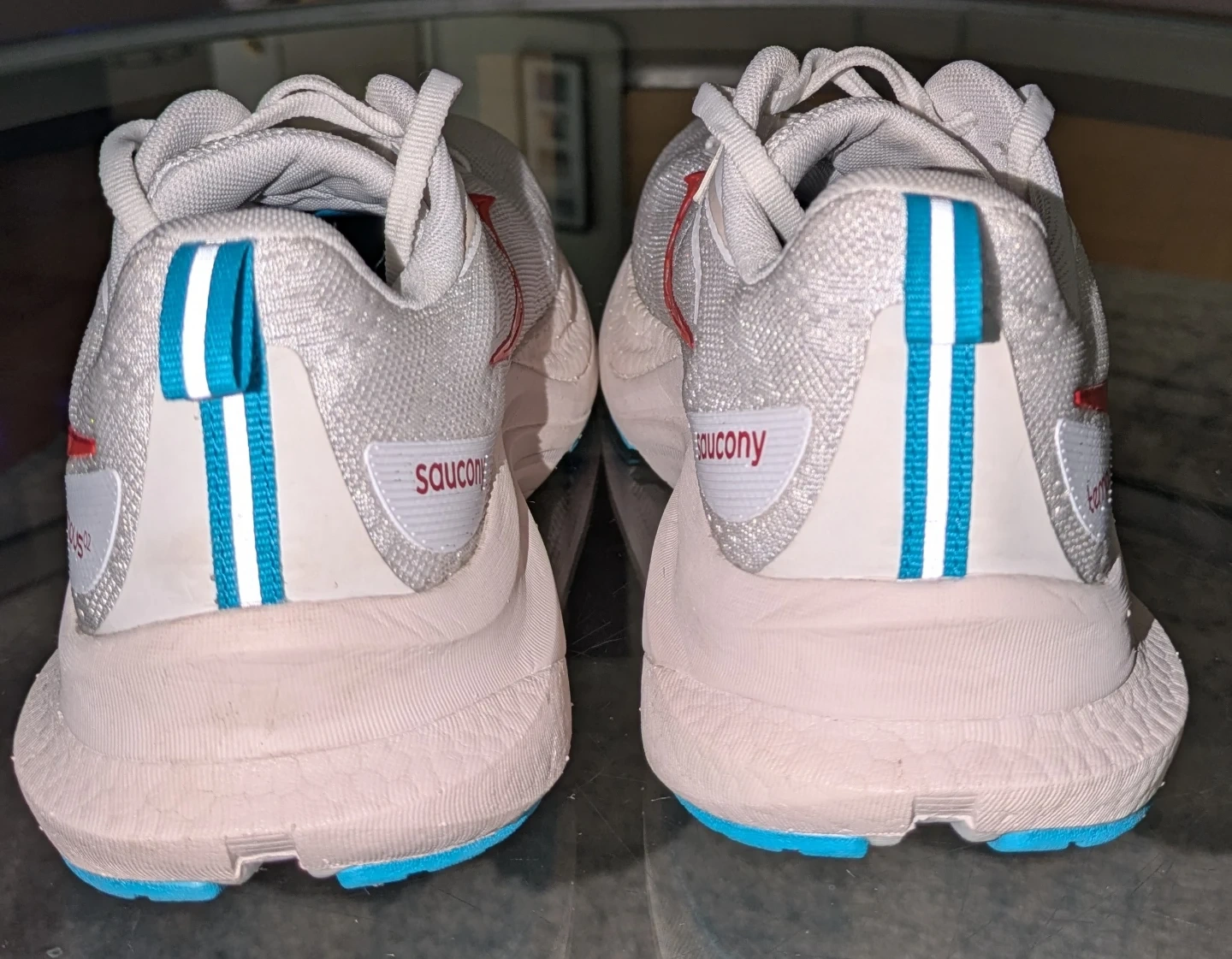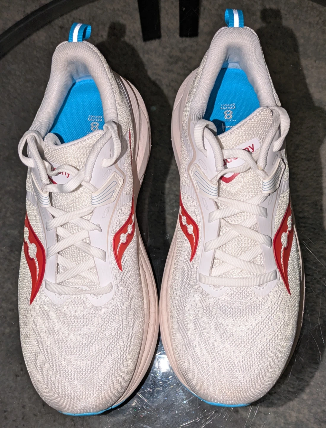 These runners have only been worn twice. They are a women's 9.5 in color white/cayenne. I ordered them online and took them for a walk only to realize that the toe box wasn't wide enough for me. They are too narrow for my feet. I should have ordered a wide fit. I love the saucony brand. I have another pair of runners and they have been a dream to walk in. This is a great stability shoe with great support and plush cushioning. I attempted to return them but unfortunately saucony won't accept it because they've been worn and they are not defective. I paid $201 for this pair. I need to get a new pair as my old ones have worn through on the soles. If interested please text or call me at 647-655-4176