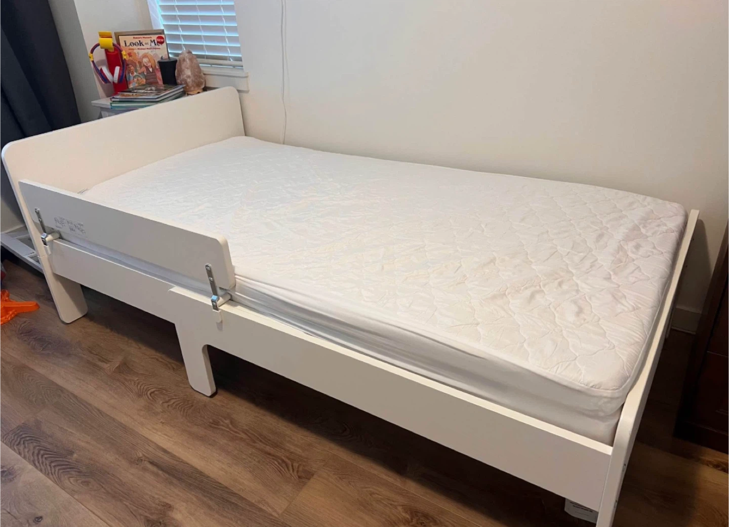 IKEA Kid’s extendable bed with side rail AND mattress + Bloom Mattress Topper